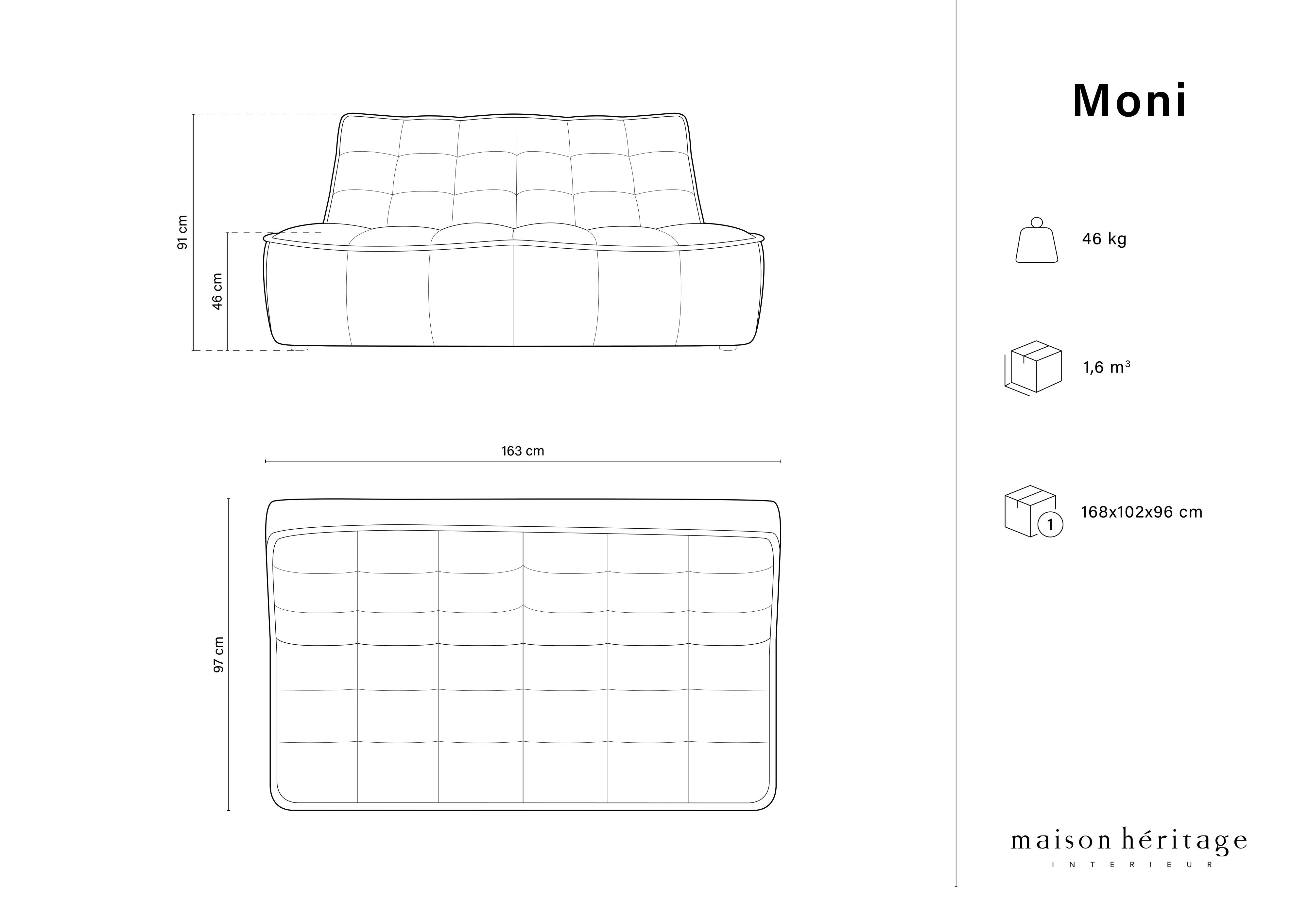Die Polsterung aus natürlichem Rindsleder ist sanft geprägt, wodurch ihre Struktur sehr angenehm zu berühren ist. Ergonomische Formen bieten eine bequeme Unterstützung für den gesamten Rücken. Die Kollektion Moni umfasst mehrere Kombinationen von Sofas und Ecksofas sowie Elemente wie Sessel, Chaiselongues und Poufs.