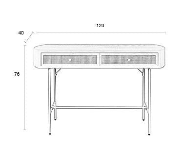 Eitelkeitstisch Amaya ist ein Möbelstück mit einem ungewöhnlichen Erscheinungsbild, das sich durch eine ungewöhnliche Form und eine harmonische Kombination aus drei verschiedenen Materialien auszeichnet. Die halbkreisförmigen Seitenwände des Körpers und die Fronten von Schubladen mit Rattaneinsätzen in natürlicher Farbe ziehen Augen an. Der Dressingkörper besteht aus beige lackiertem MDF und Metallbeinpulver, die in der gleichen Schatten konsistent sind. Unter der Arbeitsplatte gibt es zwei Schubladen, die einen praktischen Speicherplatz bieten.