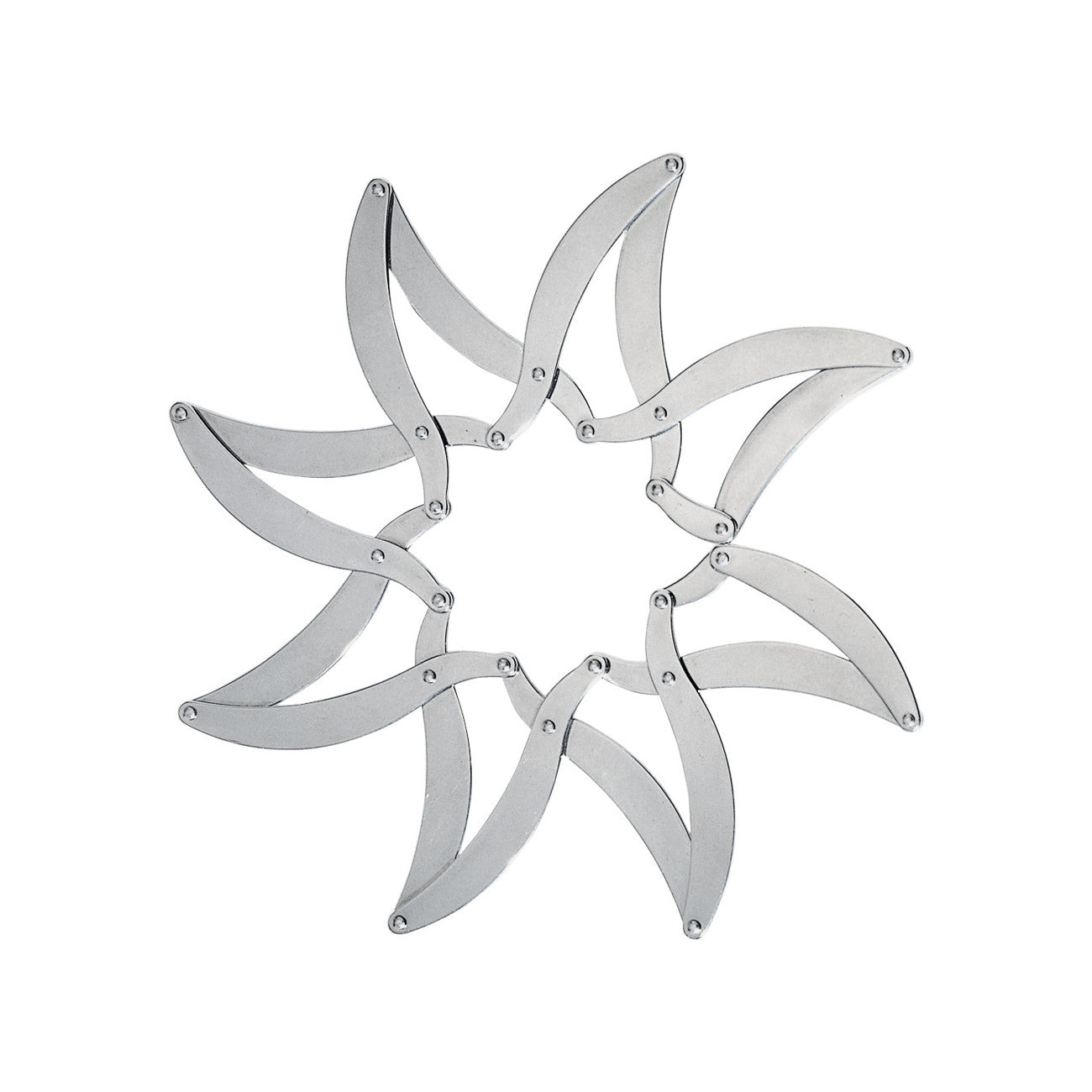 Heiße Schiffe Pad Augh ist ein moderner und stilvoller Akzent für die Küche. Dank der nachdenklichen Struktur, die aus Metallelementen besteht, die die Form von Blumenblättern bilden, schützt es die Tischoberfläche effektiv vor der hohen Temperatur heißer Gefäße.