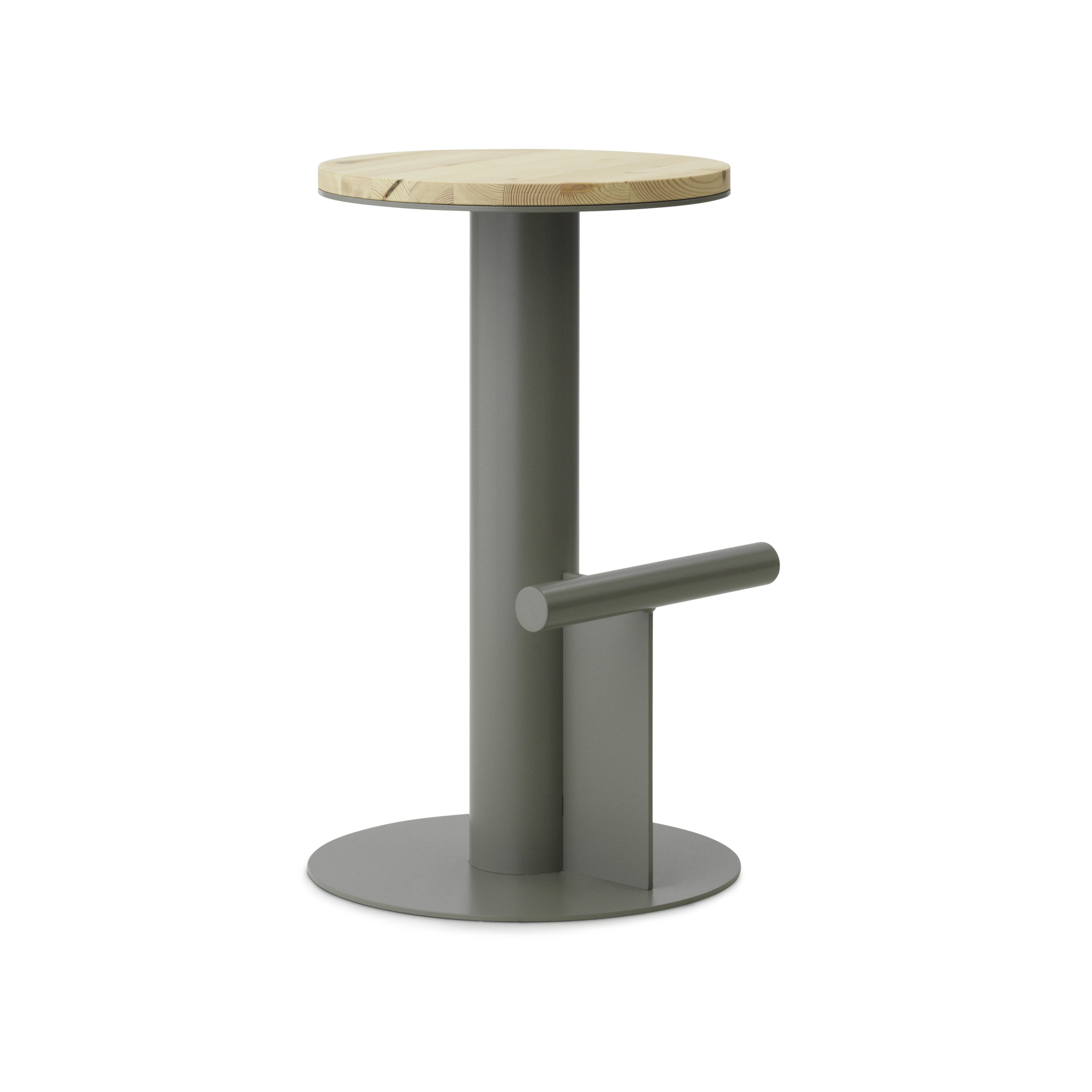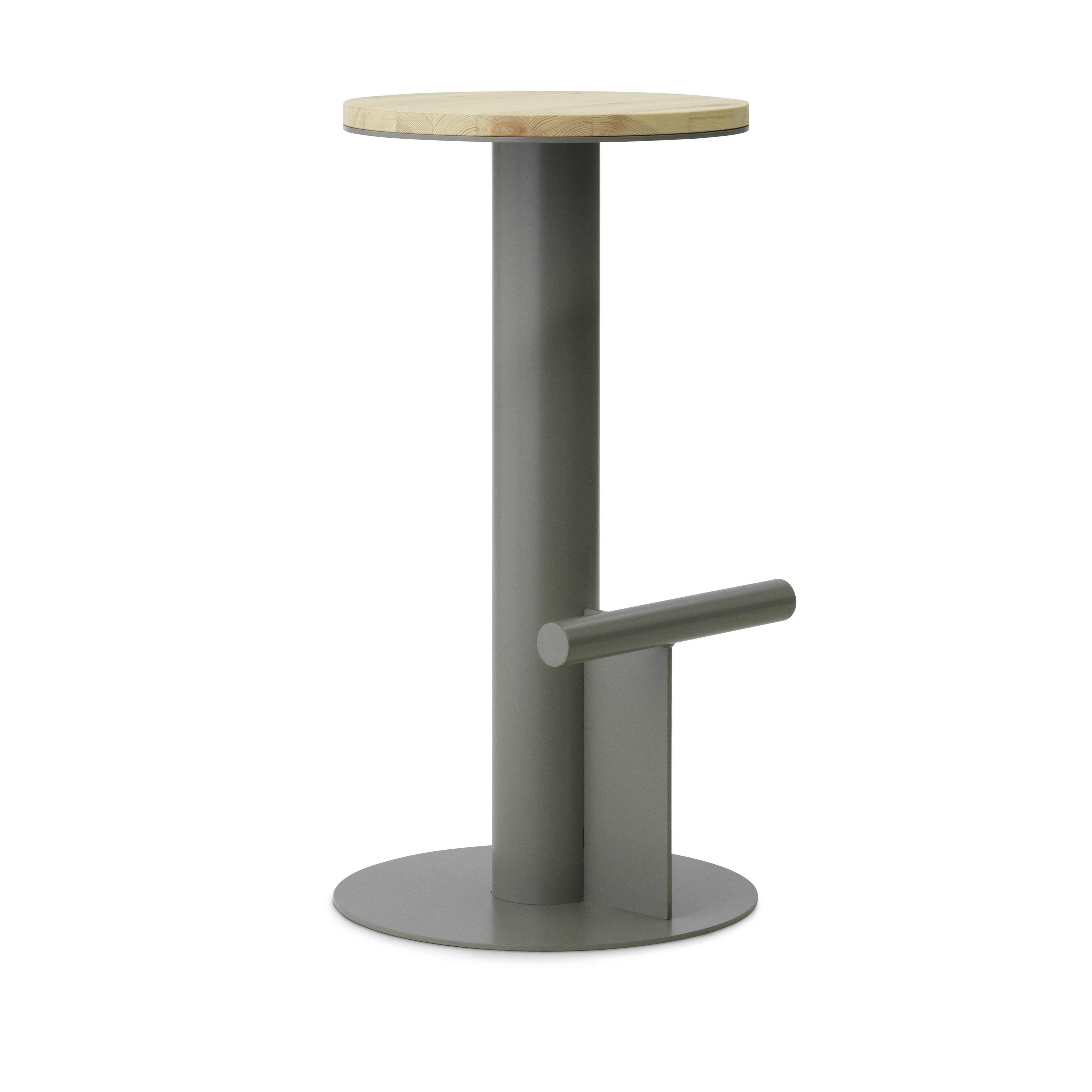Hoker Das Feld ist ein ausgeprägtes Design ohne unnötige Details, in dem der Schwerpunkt auf hoher Qualität, langlebigen Materialien und sauberem, elegantem Design des Designs gelegt wurde. Trotz seiner Einfachheit sticht das Feld von den klassischen Barhockern ab. Ein runder, fester Kiefernsitz ruht auf einer ungewöhnlichen Basis aus pulvergesteuerter Stahlrohr. Ein horizontal platzierter, kleinerer Stahlstab fungiert als Fußstütze und ist ein dekoratives Element.
