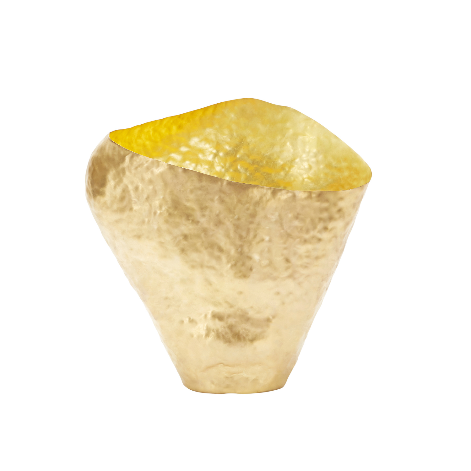 Misa Bash ist ein einzigartiges, handgeschmiedetes Gefäß, das Funktionalität und dekorativen Charakter vereint. Jedes Exemplar ist einzigartig, dank der handwerklichen Herstellung aus gehärtetem Messing, was ihm ein unverwechselbares Aussehen und rohe Eleganz verleiht.