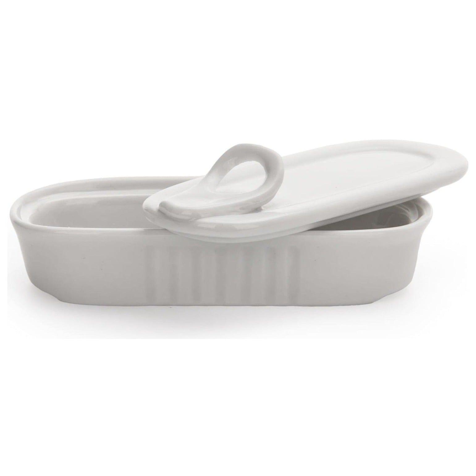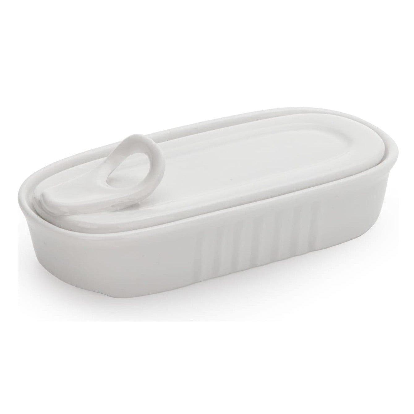 Der Behälter besteht aus weißem Porzellan.