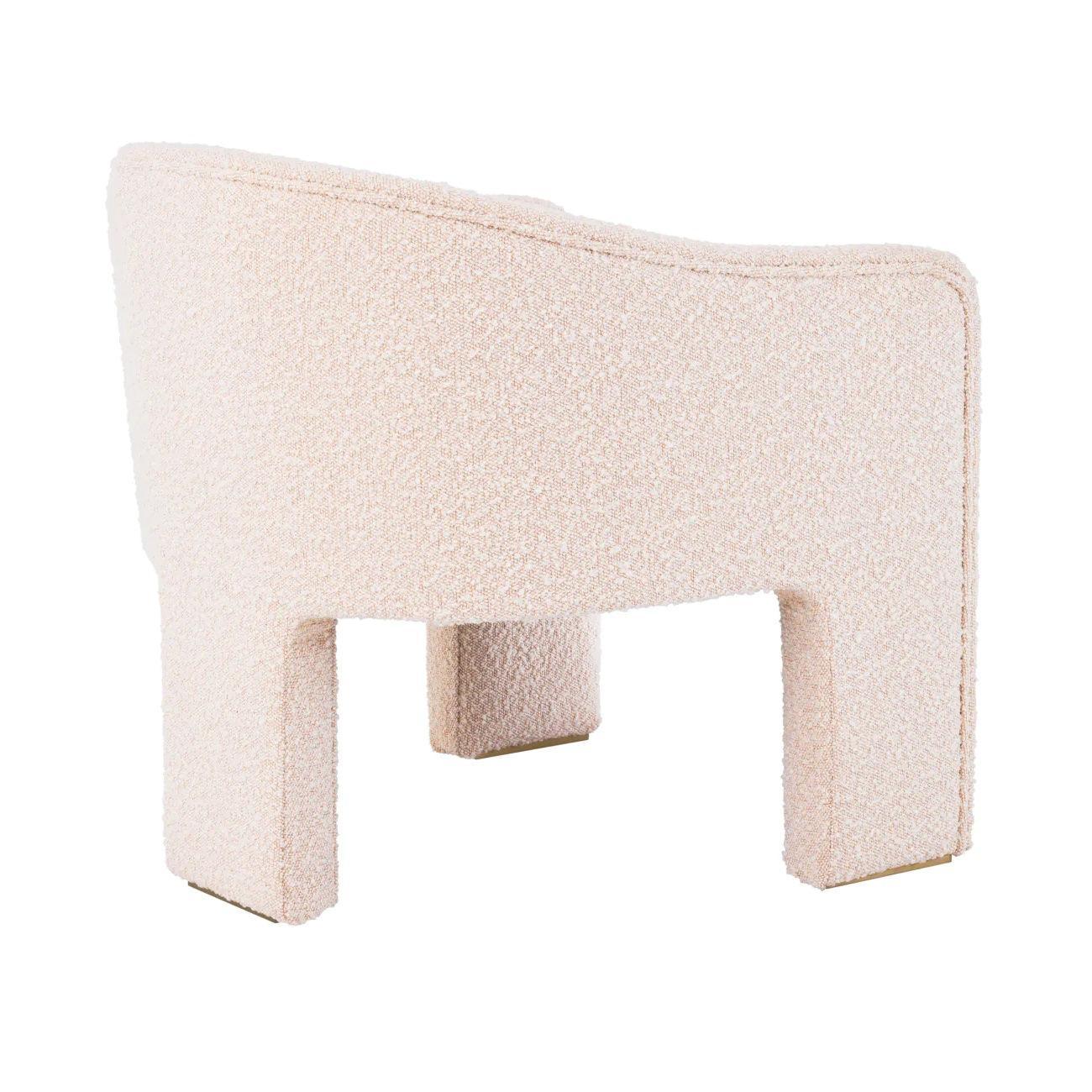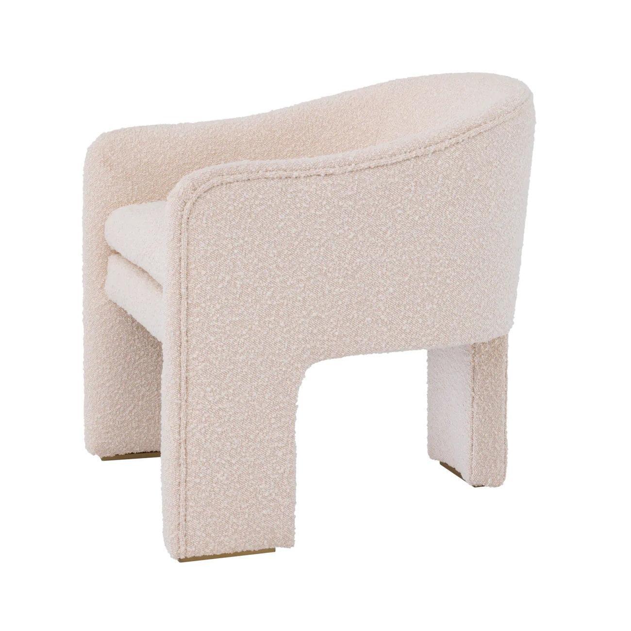 Sahne Sessel Pebbles ist vollständig mit weichem Boulé in einem zarten Sahnenschatten gepolstert, was ihm einen gemütlichen Charakter verleiht. Sein badebautischer Sitz und drei breite Beine sind eine harmonische Kombination aus Funktionalität und Ästhetik.