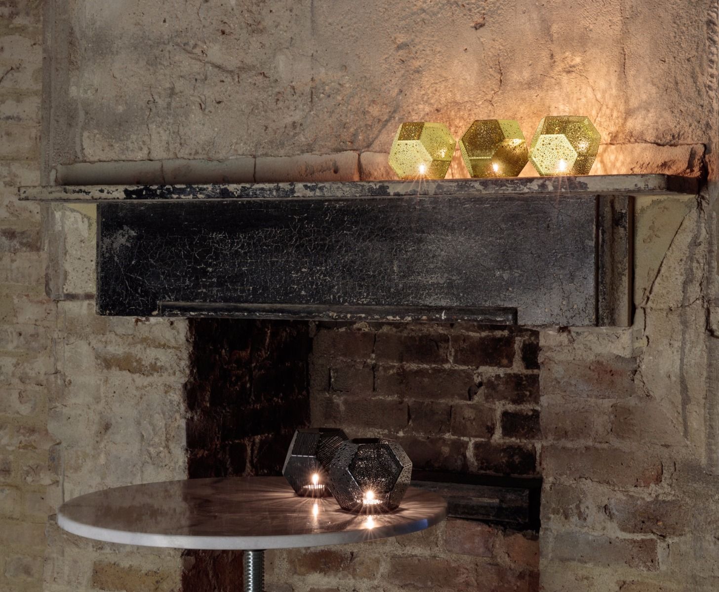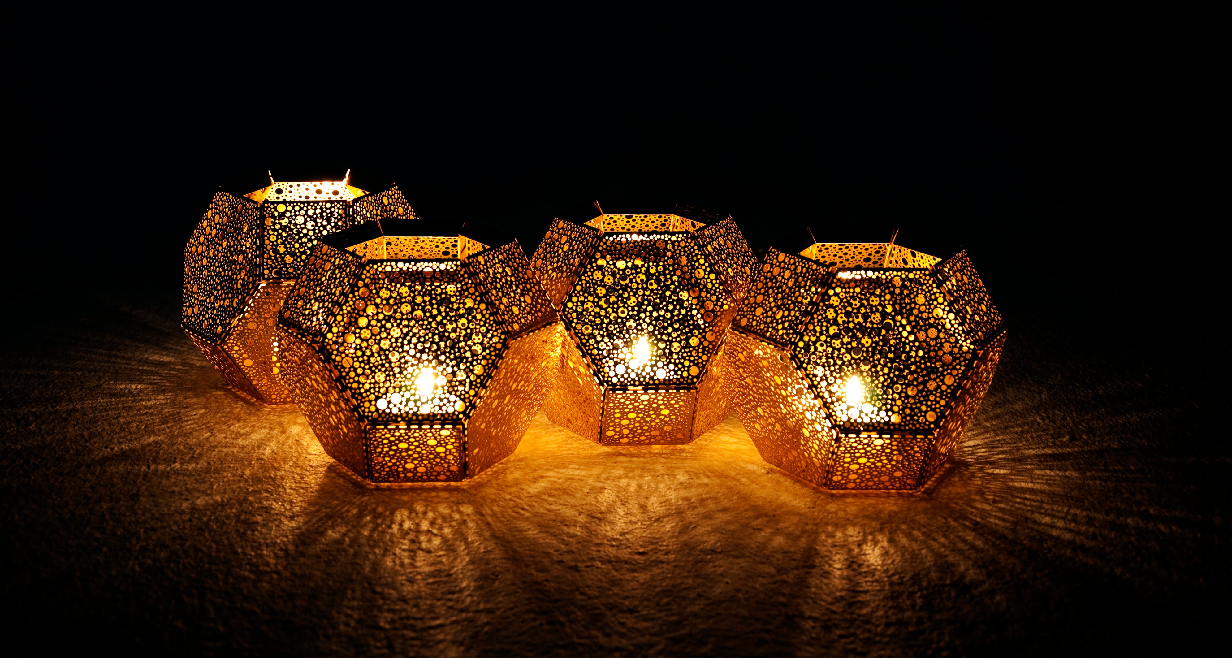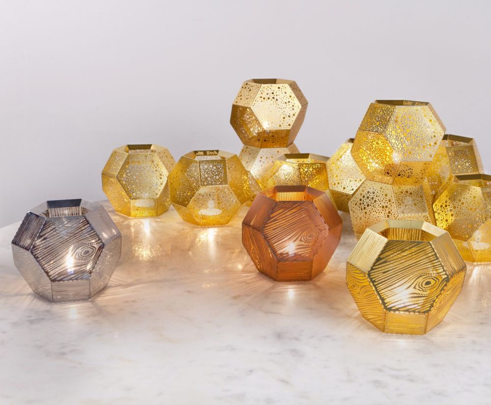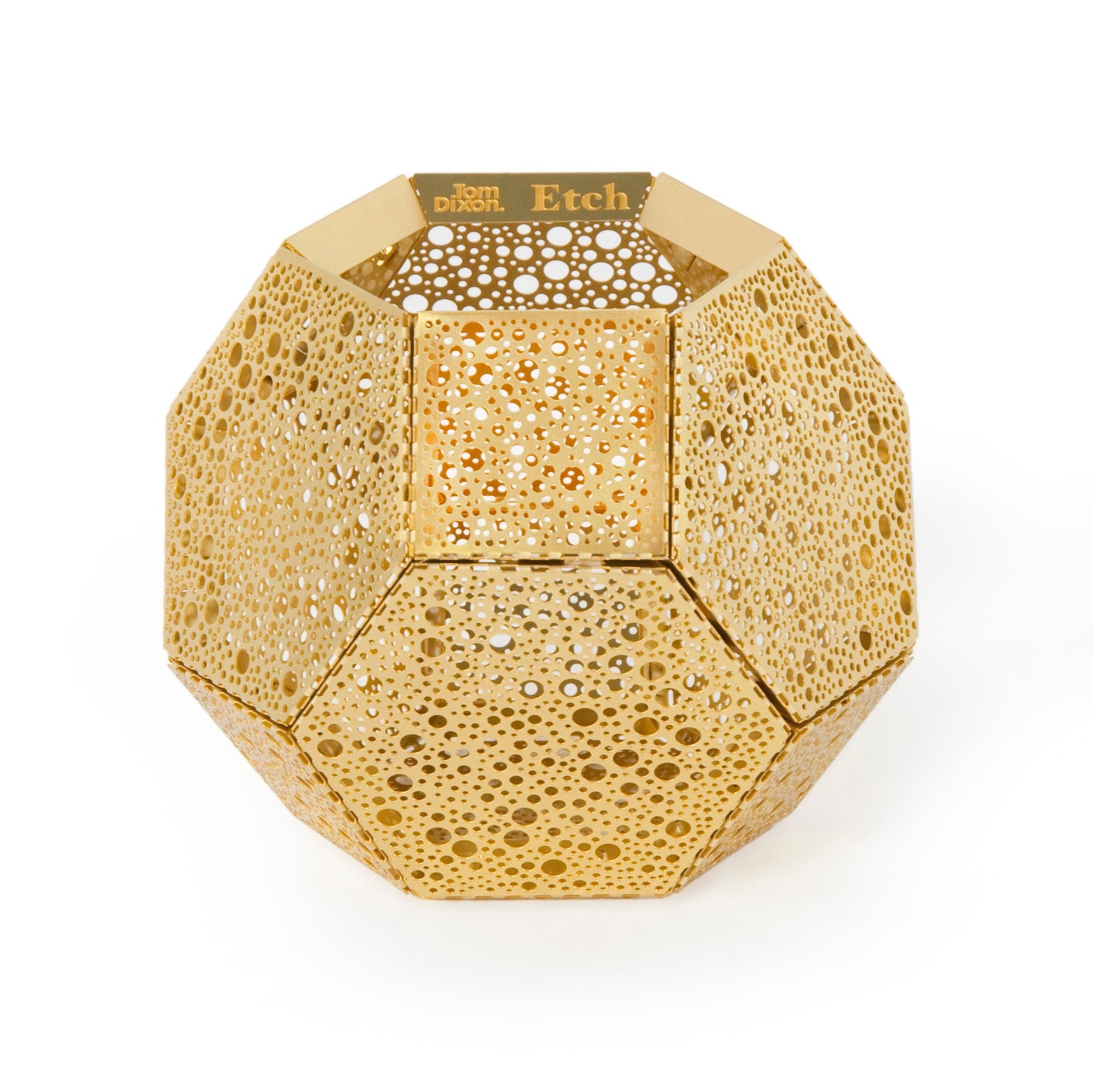 Ätzt Eleganter Kerzenhalter, was nach einer Entzündung der Kerze ein weiches, Umgebungslicht ausgibt. Sein einzigartiges Design basiert auf präzise Metallmetallblättern, die wie viktorianische Blechspielzeuge kombiniert wurden. Dank der digitalen Verdauung mit Säure wurde das Ätzmuster so konzipiert, dass sie das Licht effektiv filtern und ein kompliziertes Schattenspiel in der Umgebung erzeugen.