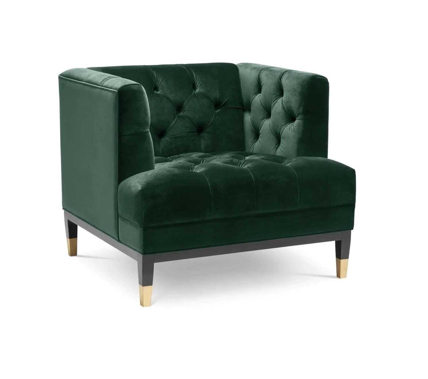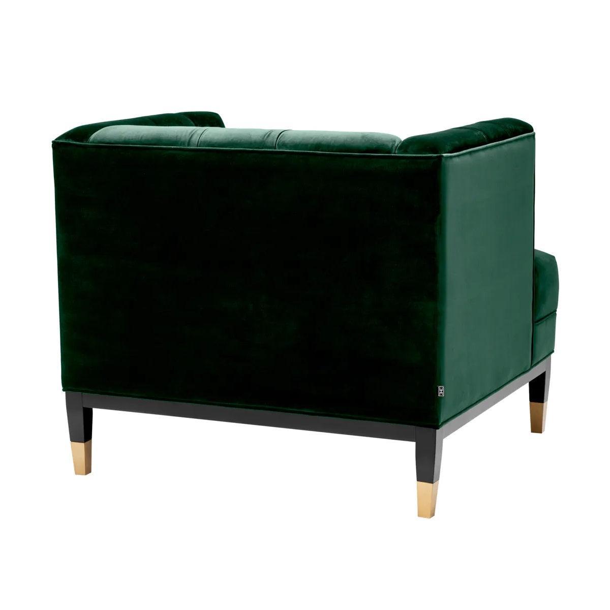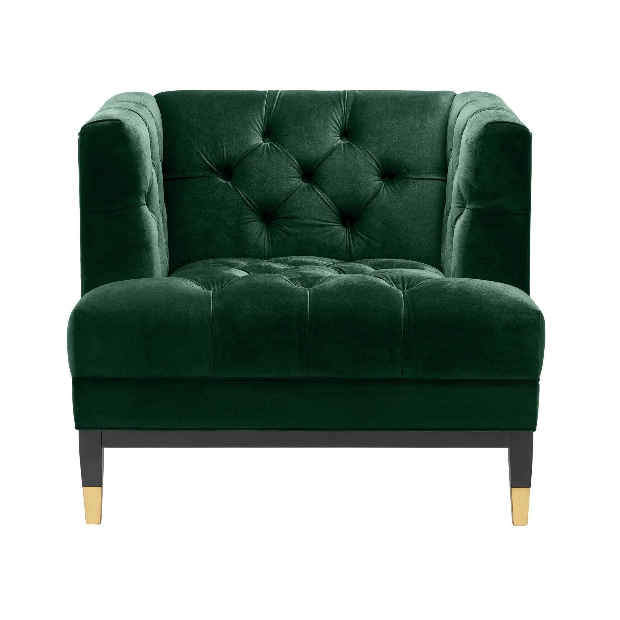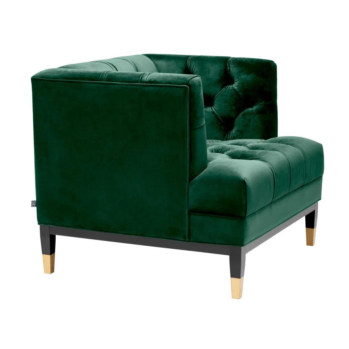 Dark -Green Savonas tiefe Samtpolsterung, dekoriert mit charakteristischen Knöpfen, verleiht dem Sessel Tiefe und Charakter. Jeder Knopf, jede Naht wurde sorgfältig entworfen und hergestellt, um die luxuriöse Natur der Möbel zu betonen. Schwarze und mobile Beine ergänzen das Ganze und verleihen dem Stuhl die Moderne und Eleganz.