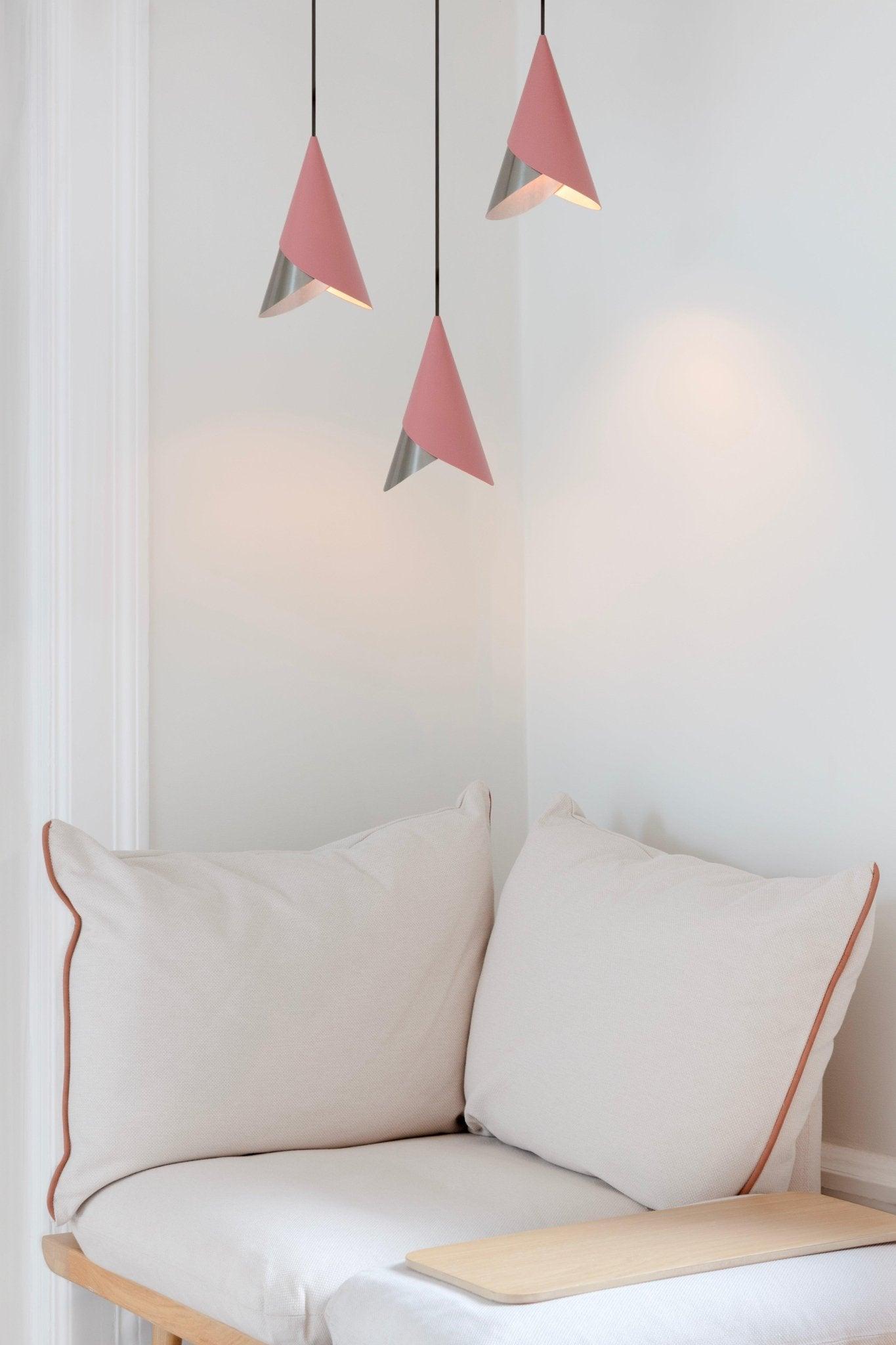 Cornet ist ein einzigartiger Lampenschirm, der Einfachheit und Funktionalität vereint und die Essenz skandinavischer Eleganz verkörpert. Er besteht aus zwei subtil geformten Metallkegeln, die drehbar und austauschbar sind, was es ermöglicht, Licht und Aussehen perfekt an Ihre Vorlieben anzupassen.