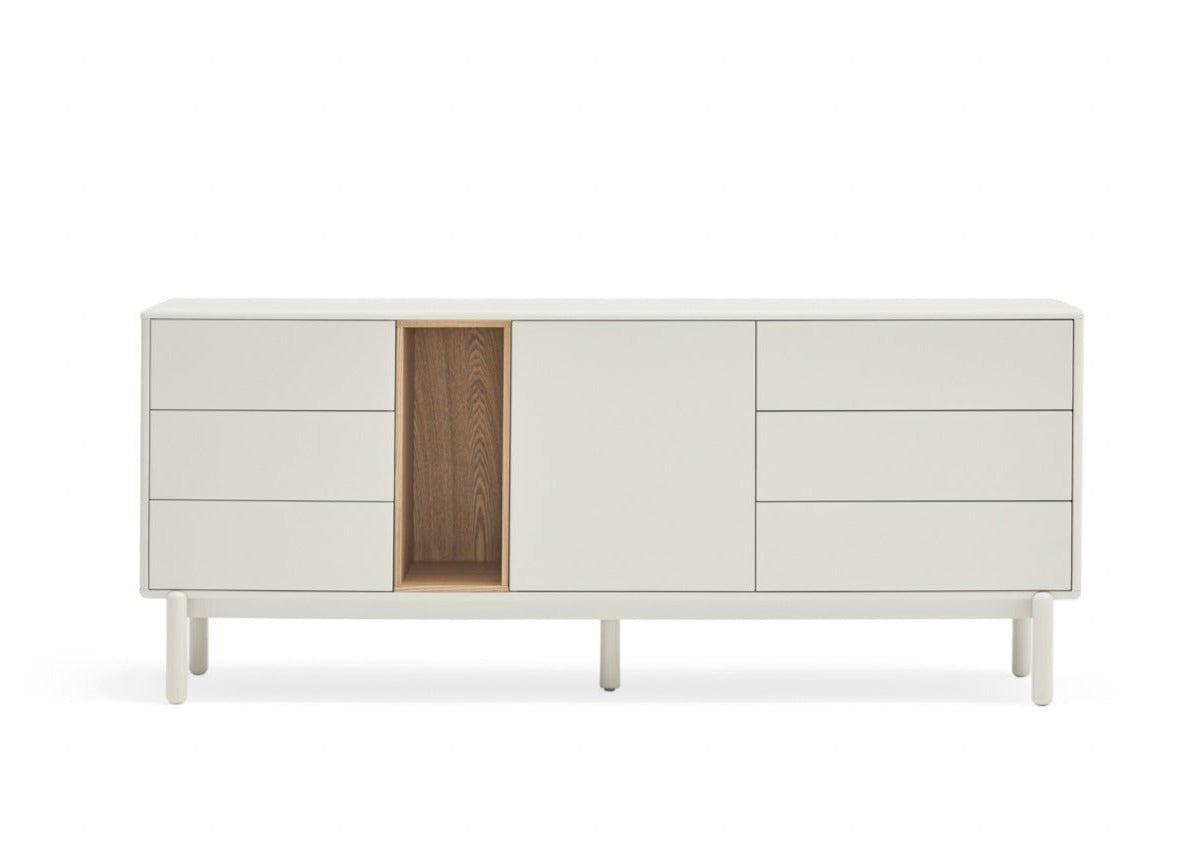 Kommode Corvo wird dank der geräumigen Regale und Schubladen den Raum im Wohnzimmer oder Esszimmer ordnen. Das interessante Design von Eric Cambres und Carlos Garcia umfasst auch ein vertikales Regal ohne Front, das es ermöglicht, Gegenstände als zusätzliche Dekoration zu präsentieren.