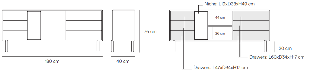 Kommode Corvo bietet dank der geräumigen Regale und Schubladen, Ordnung im Wohnzimmer oder Esszimmer. Das interessante Design von Eric Cambres und Carlos Garcia umfasst auch ein vertikales Regal ohne Front, das es ermöglicht, Gegenstände als zusätzliche Dekoration zu präsentieren.