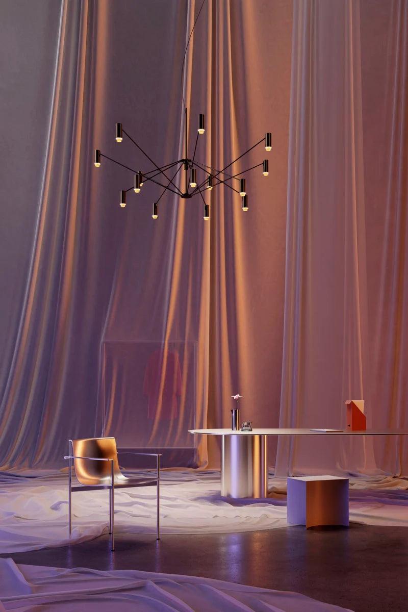 Entfalten oder bündeln Sie das Licht mit dem neuesten Design von PerezOchando – einer flexiblen, großformatigen Lampe für große Räume. Die Hauptstruktur besteht aus einem großen, schwarzen Stiel mit einer goldenen Oberfläche, von dem Stangen mit Reflektoren ausgehen. Die Stangen können verschoben werden, um das Licht zu erweitern oder zu fokussieren. Die Reflektoren mit Ringen in Elfenbein, Terrakotta oder Gold streuen das Licht gleichmäßig.