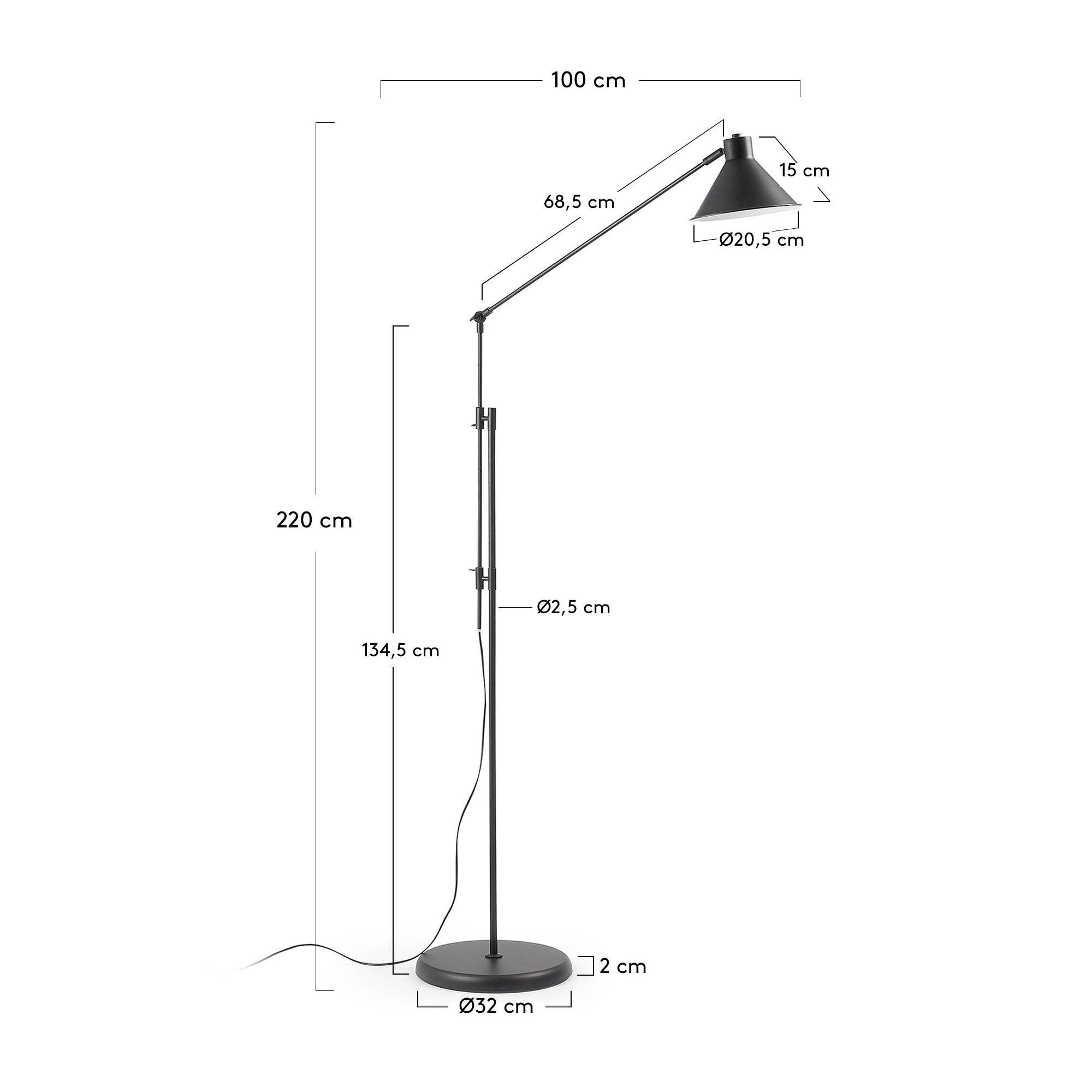 Dions Stehlampe ist mit einem Lampenschirm ausgestattet, der in irgendeiner Weise eingestellt werden kann. Perfekt, um ständig eine perfekte Atmosphäre zu schaffen.