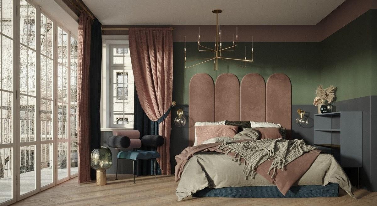 Kopfteil Roll mit einem abgerundeten Berg stammt aus der Roll & Roll -Kollektion, die von Kataryna Jasyk entworfen wurde. Die Polsterung bestand aus Samtstoff. Auf der Rückseite befinden sich 2 Griffe für die Montage an der Wand.