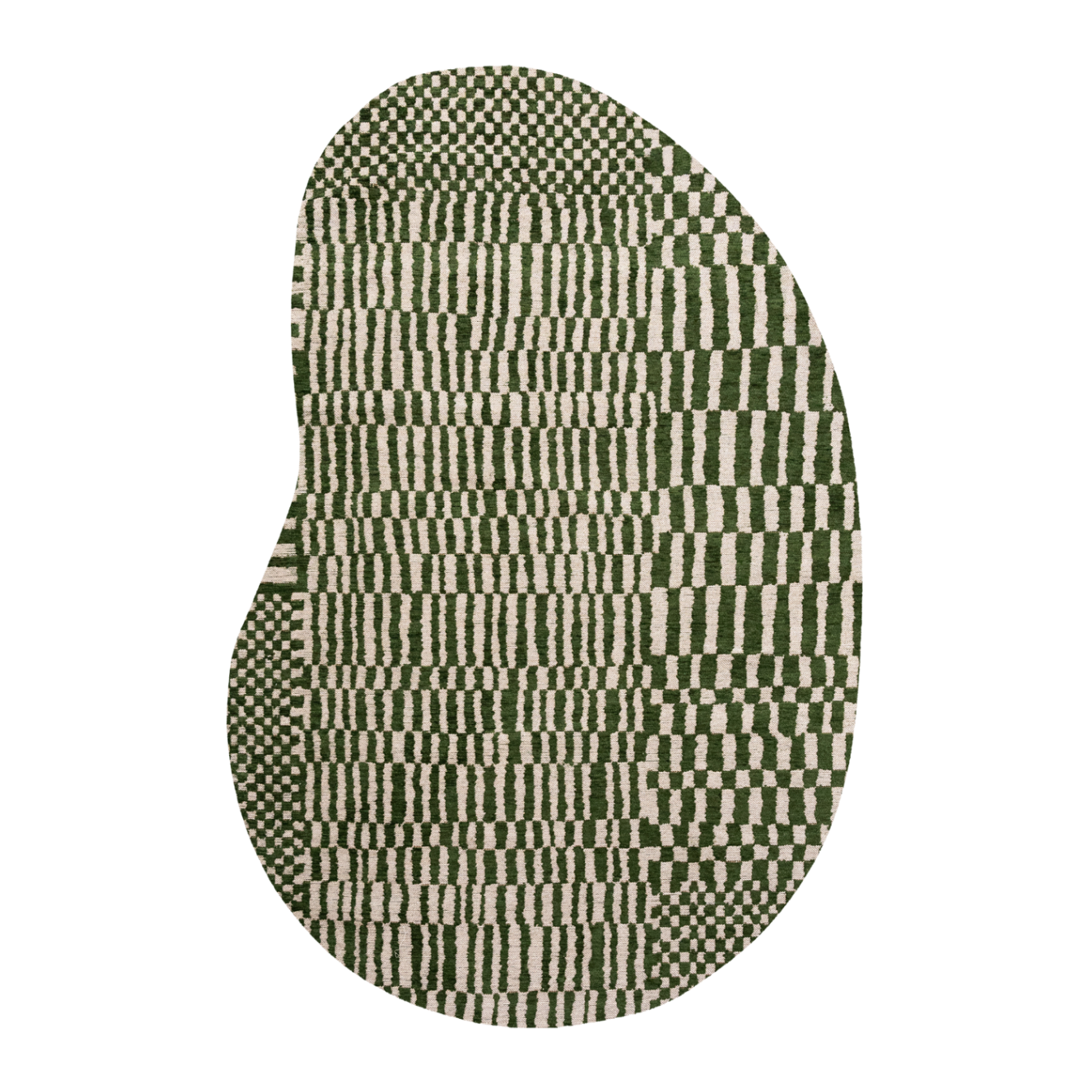 Unregelmäßiger Teppich Berber. Seine unregelmäßige Erdnussform und das geometrische, berberische Muster ziehen die Blicke auf sich und bringen Leichtigkeit sowie einen künstlerischen Charakter in den Raum. Dank des flachen Gewebes ist der Teppich pflegeleicht, schmutz- und staubresistent, was ihn ideal für stark genutzte Räume macht. Das Design und die Farbgebung harmonieren perfekt mit minimalistischen, Japandi-, Boho- und modernen Arrangements und verleihen ihnen Harmonie und zeitlosen Charakter.
