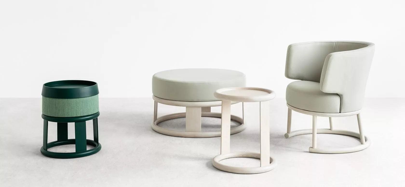 Die ebenfalls Sammlung ist ein moderner Blick auf das klassische gebogene Holzerbe. Der breite Biegewinkel von Buchenholz auf langen Möbelformen ist ein einzigartiges Element in modernen Biegemöbeln, da es das einzigartige, zunehmend einzigartige Erbe der Technologie des 19. Jahrhunderts ist. Die weiche, die die Form eines gepolsterten Stuhls aus der genannten Sammlung umwickelt, ermutigt bis zur Entspannung, und die Abmessungen und Konstruktionen wurden ausgewählt, um die kleinste Größe der Form als kleinste zu erhalten. Die ebenfalls Sammlung besteht aus: Clubstuhl, einem breiten Pouf, einem Pouf mit einem Tablett und einem Tisch.