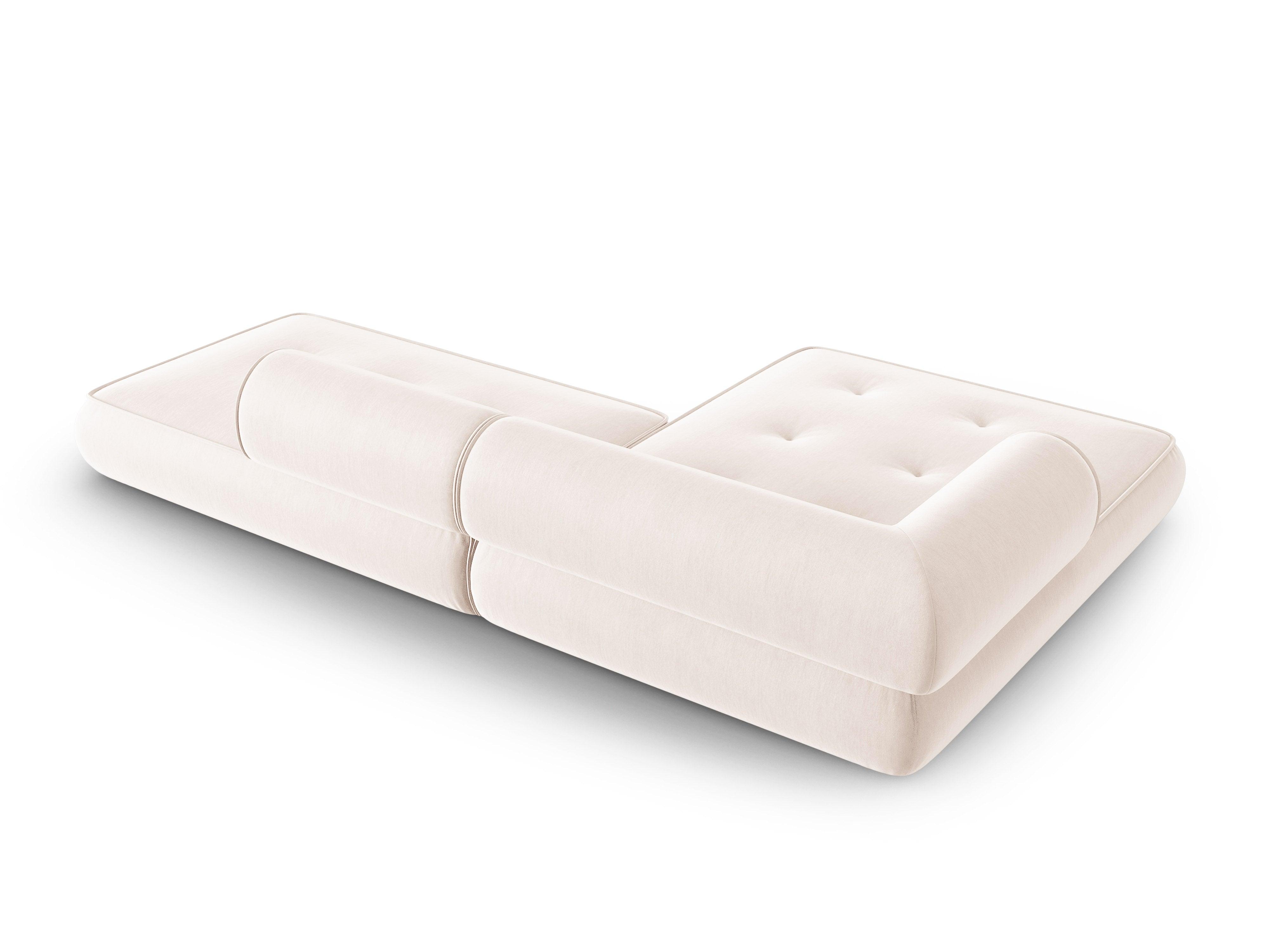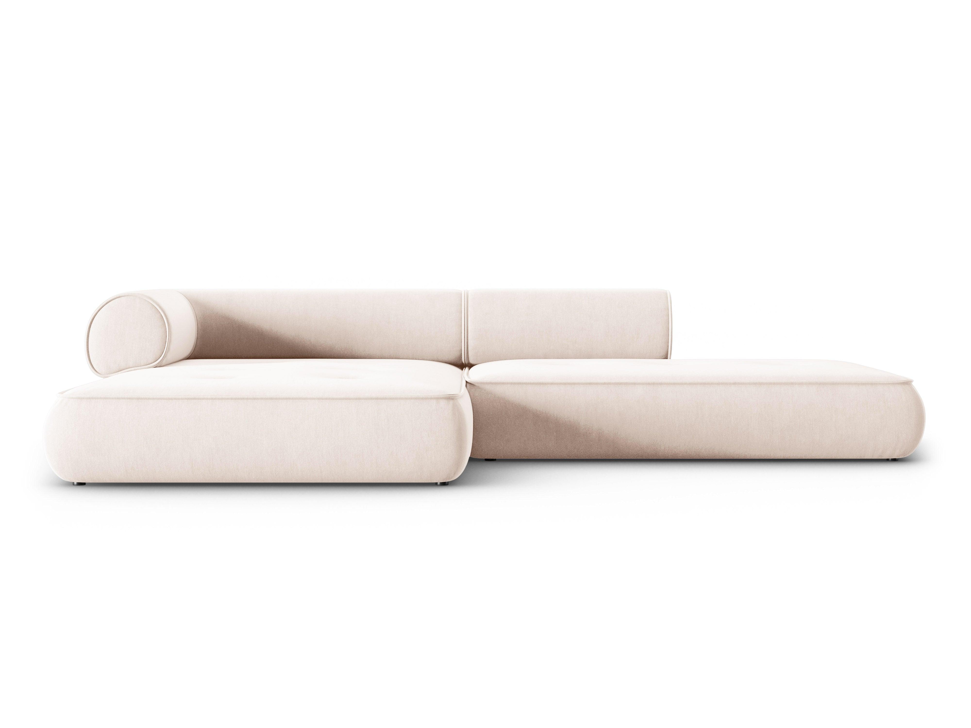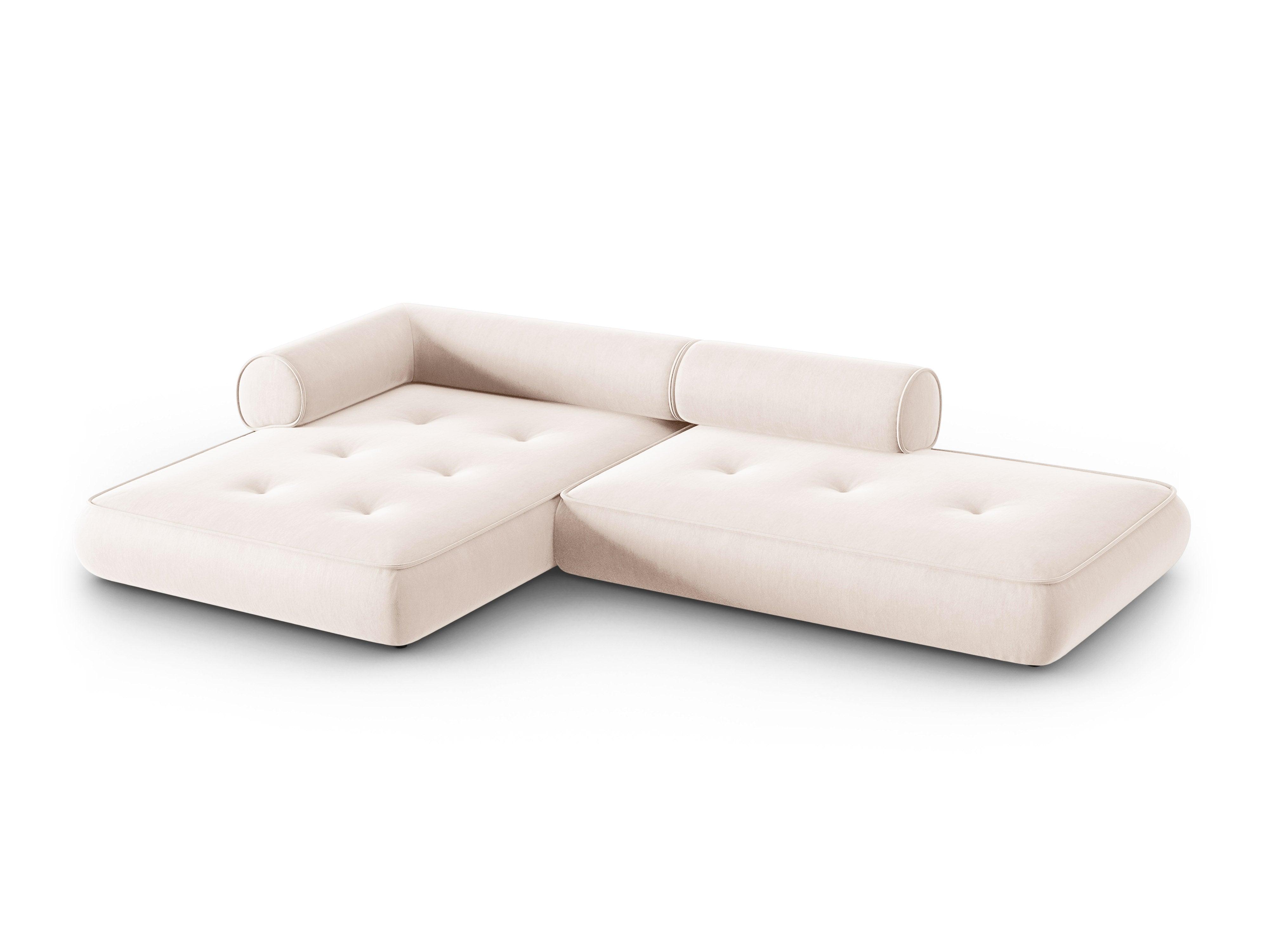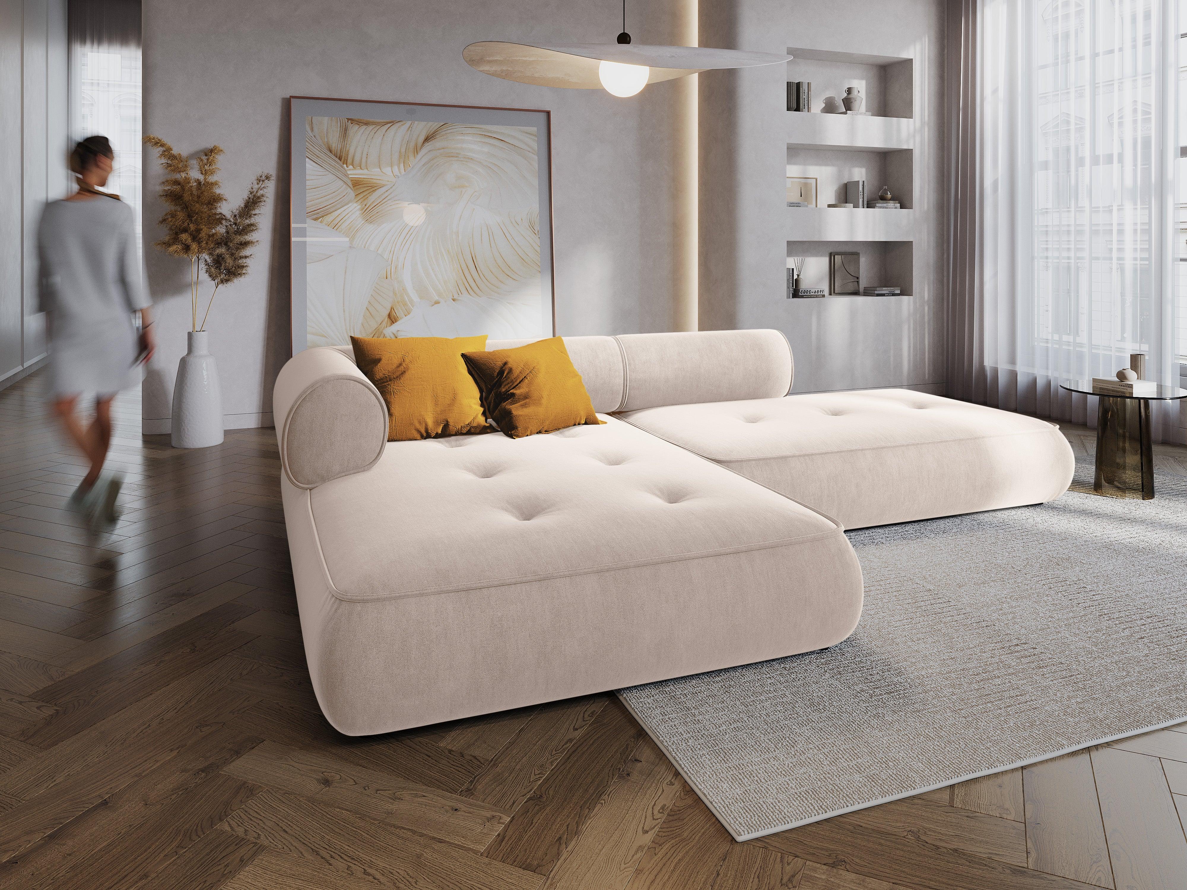 Stylischer Ecksofa Lily verleiht jedem Raum einen Hauch von zeitloser Eleganz. Die außergewöhnliche Form ist das Ergebnis eines modernen Ansatzes für zeitlose Möbelformen. Die abgerundeten Kanten der Sitzflächen haben eine äußerst originelle Form, und die Rückenlehnen bieten den richtigen Komfort beim Entspannen. Der Bezug aus Chenil-Stoff ist nicht nur praktisch, sondern auch angenehm im Griff.