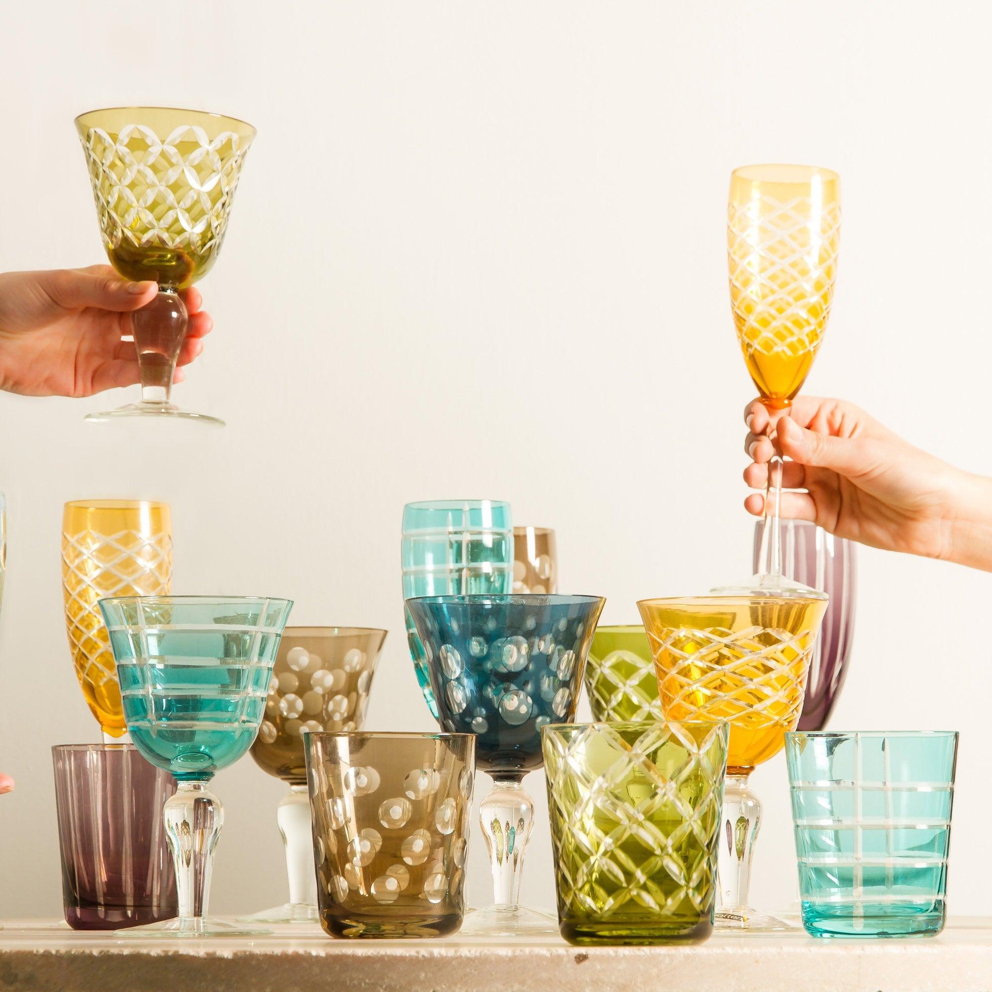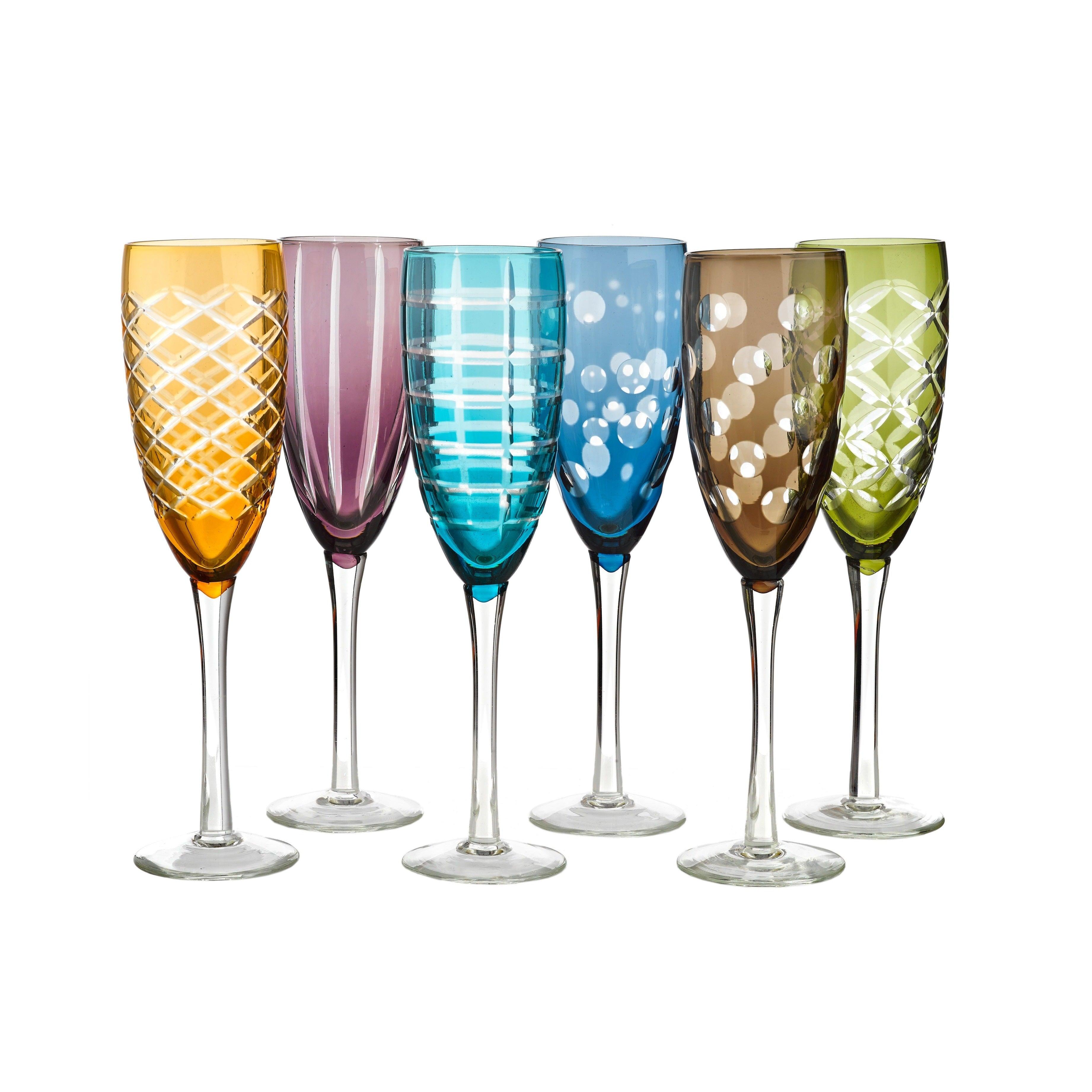 Bunte Sektgläser Cuttings sind ein Set aus mehrfarbigen Gefäßen, die ein wenig Humor in Ihr Zuhause bringen. Die interessanten Muster und das außergewöhnliche Design jedes Glases sorgen dafür, dass diese Modelle trotz ihrer einzigartigen Individualität zusammen ein harmonisches Gesamtbild ergeben. Gläser Cuttings werden eine interessante Ergänzung für Ihre Feier sein und zudem ein unkonventioneller Gegenstand für den täglichen Gebrauch.