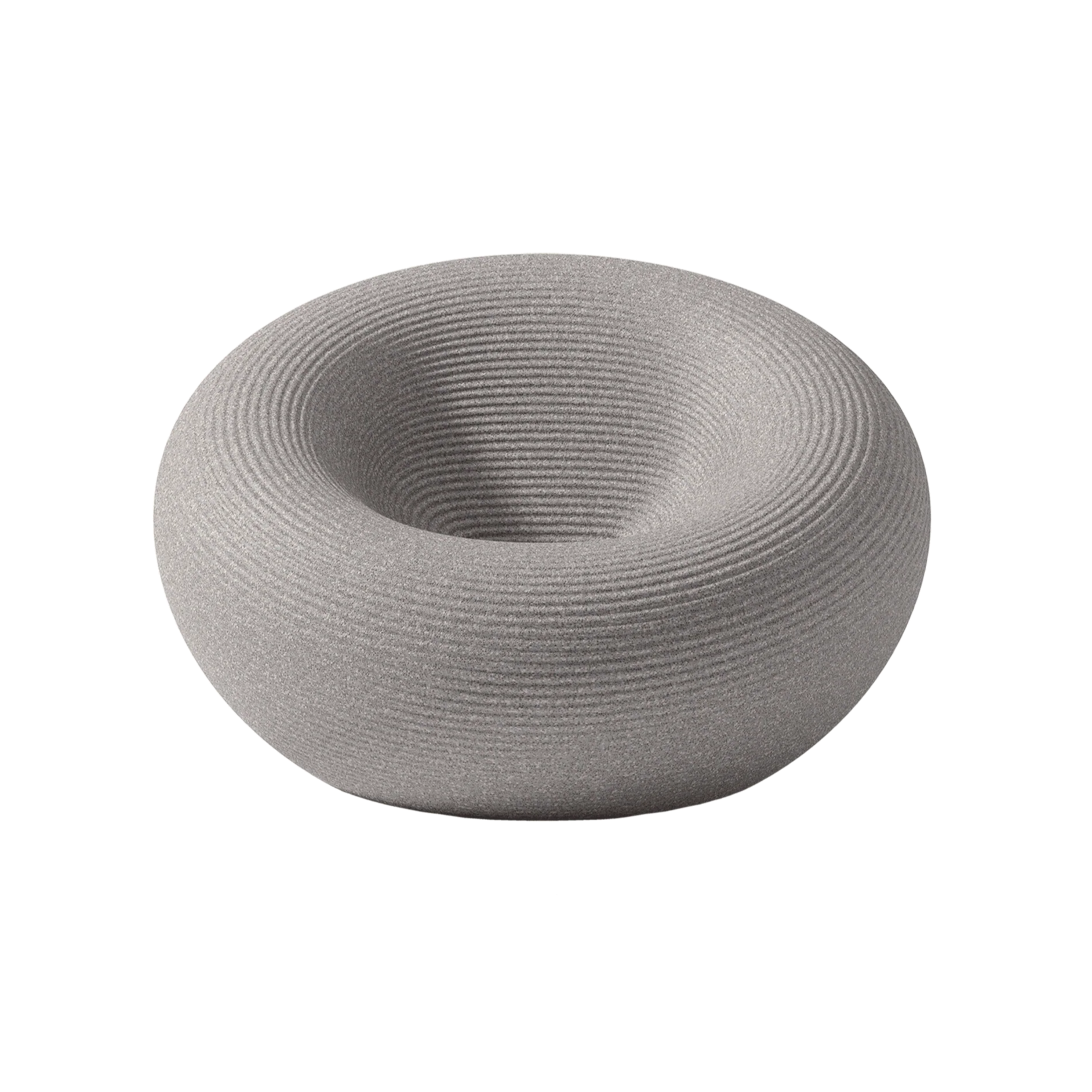 Sessel Nami ist das Ergebnis der Drehung des Abschnitts um die diagonale Achse, was ihm eine perfekt runde Form verleiht. Entlang der Oberfläche des Sessels laufen geformte Elemente, die sich vom Zentrum zu den Rändern in Form einer Sequenz von konzentrischen Ringen entwickeln. In der zentralen Partie des Sessels befindet sich ein Kanal, der den Wasserabfluss ermöglicht. Nami ist in sechs Farben erhältlich, von denen drei einen einheitlichen Farbton haben, während die anderen drei aus recycelten Materialien entstanden sind und 2-3 verschiedene Farbtöne kombinieren.