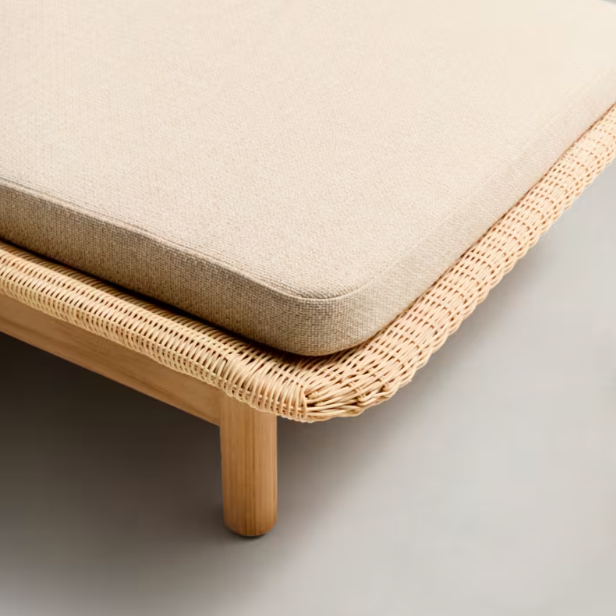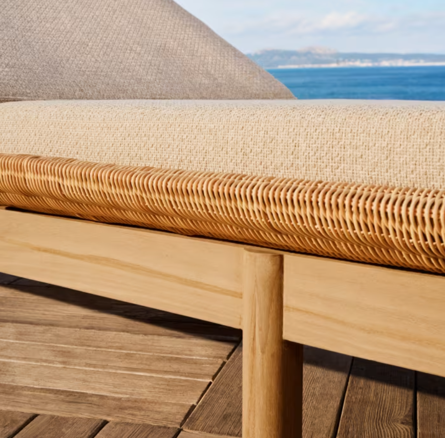 Materialien: 40% Tectona Grandis, 27% synthetischer Rattan, 20% Aluminium, 13% Stoff