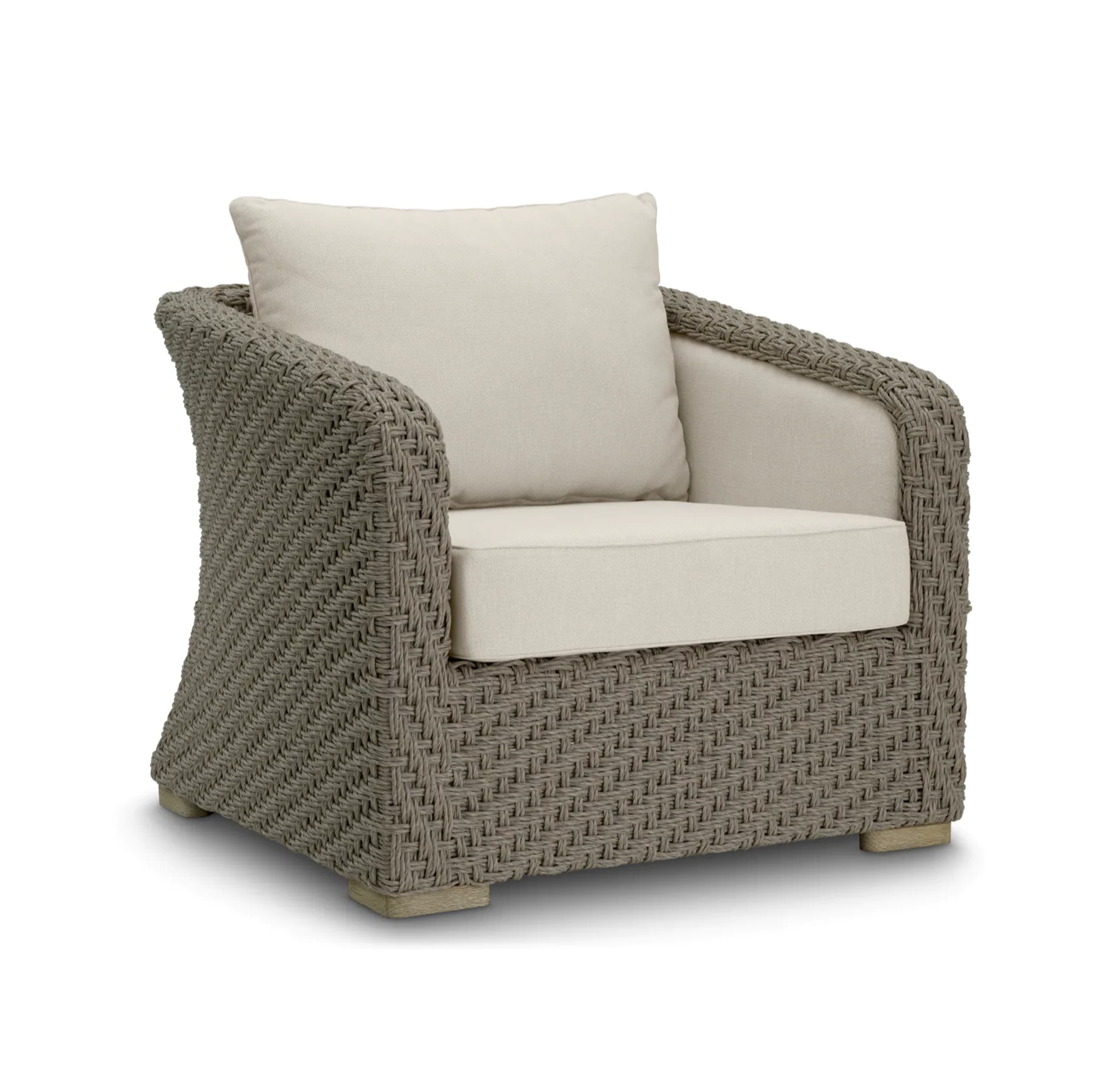 Gartenstuhl Bryson in grauem Farbton mit beigem Bezug ist eine harmonische Verbindung von Eleganz, Langlebigkeit und Komfort. Seine Konstruktion aus luxuriösem, geflochtenem Rattan in subtiler grauer Farbe verleiht ihm einen modernen Charakter und sorgt gleichzeitig für außergewöhnliche Wetterbeständigkeit.