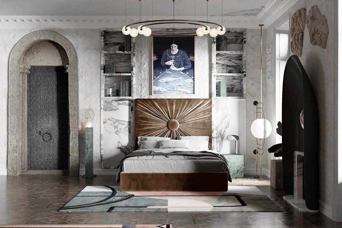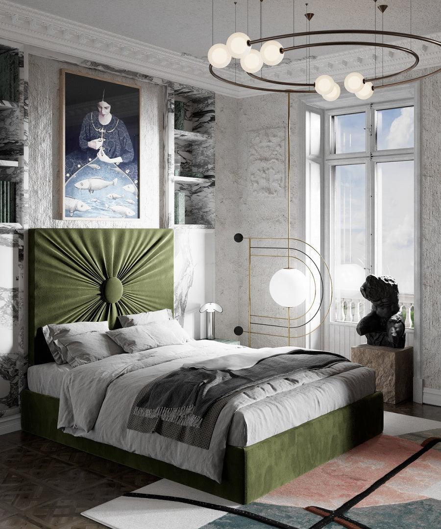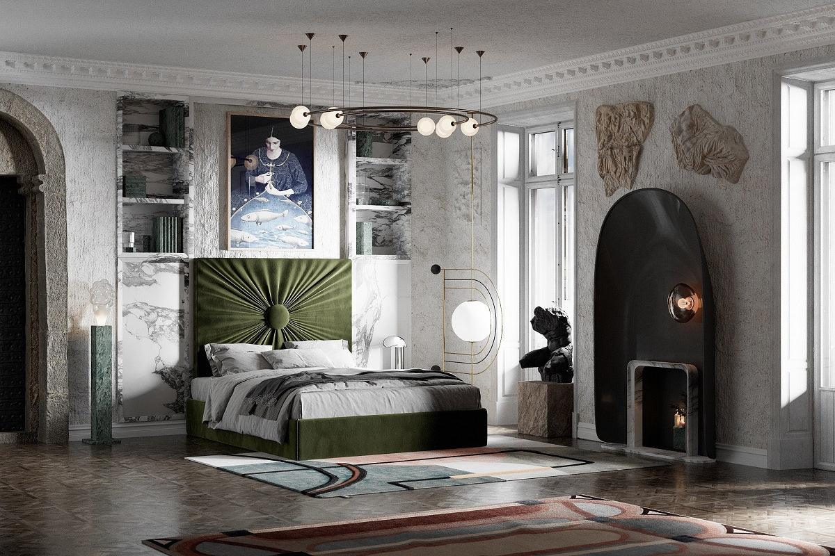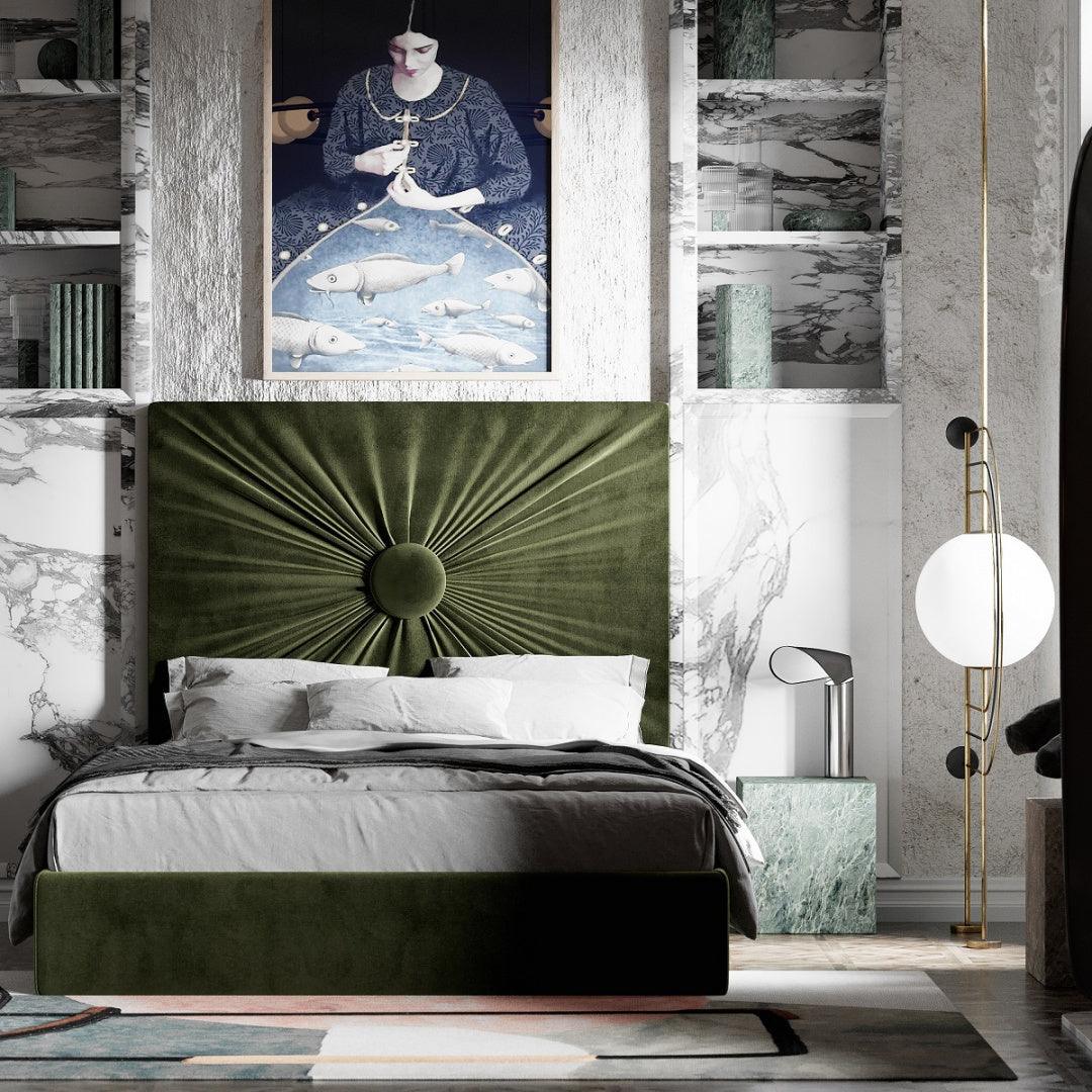 Dieses erstaunliche Design von Katarzyna Jasyk ist die Quintessenz von moderner Eleganz. Das Bett ist aus einem angenehmen und strapazierfähigen samtigen Stoff gefertigt. Die außergewöhnliche Kopfstütze, die dem Schlafzimmer einen originellen Charakter verleiht, erinnert an die Sonne im Zenit. Wenn Sie morgens in so einer besonderen Einrichtung aufwachen, wird der Tag sofort schöner.
