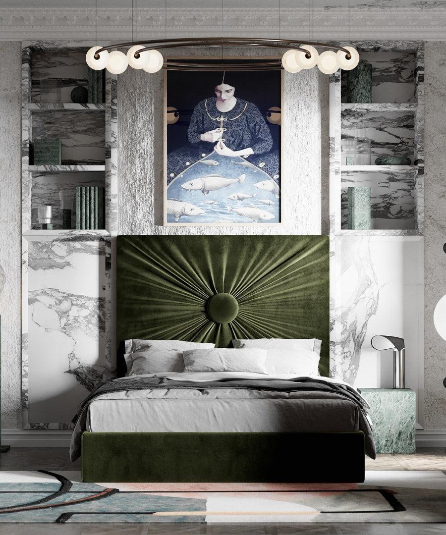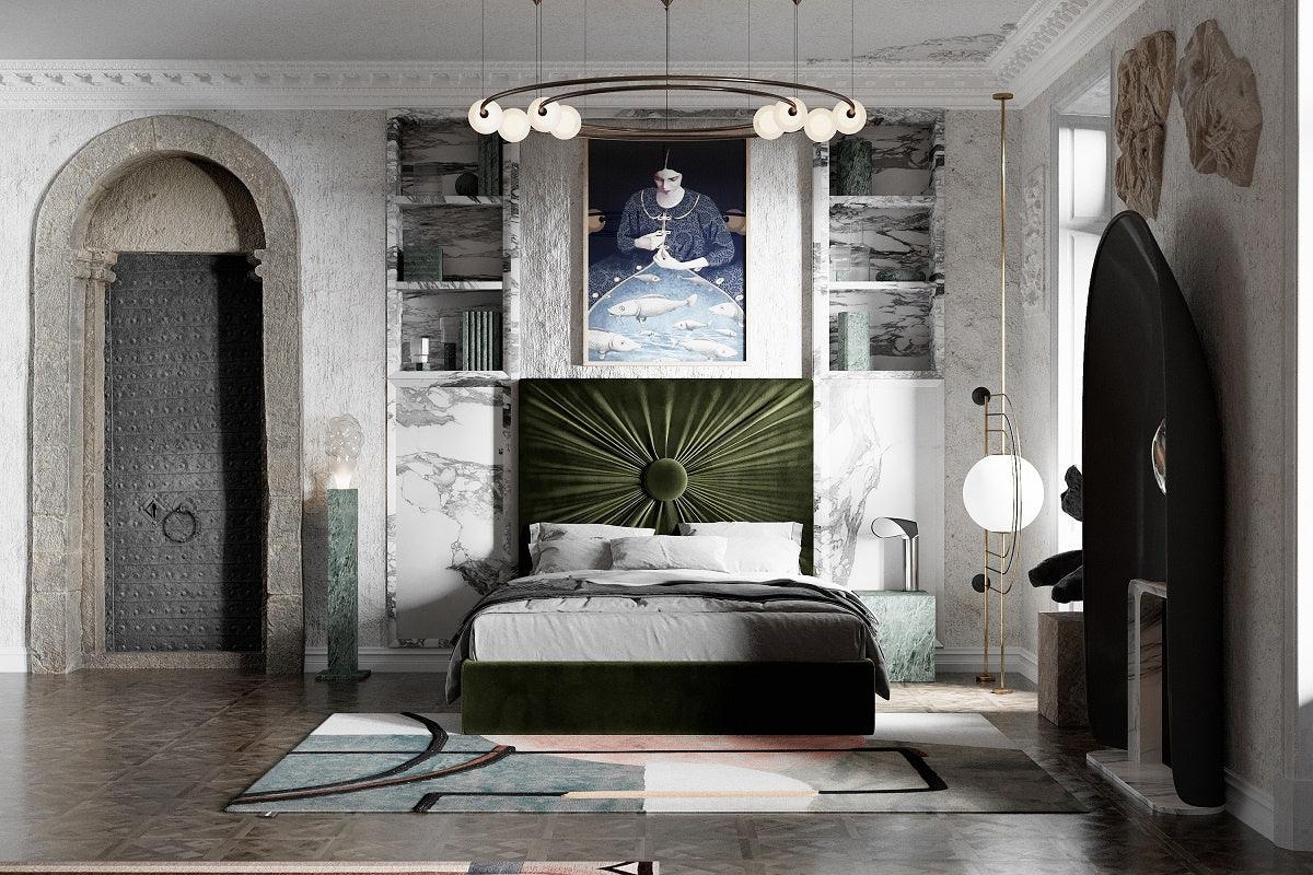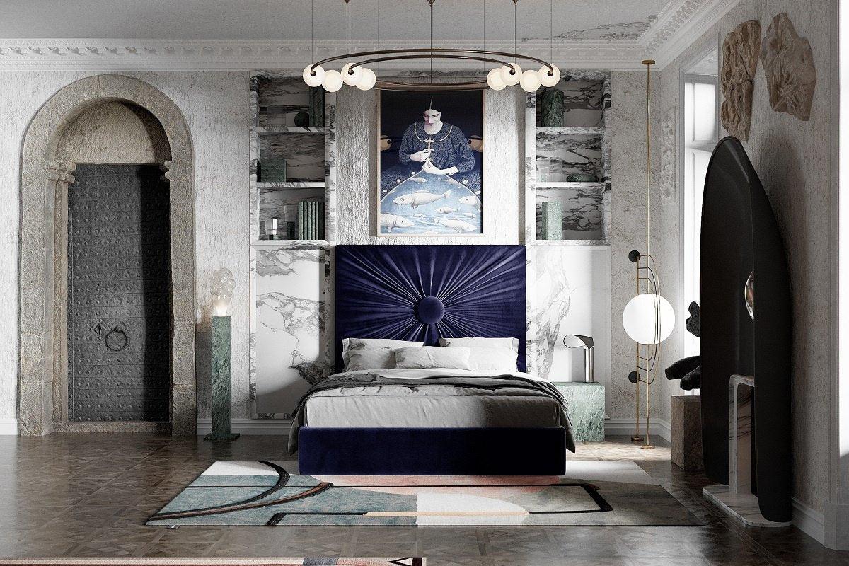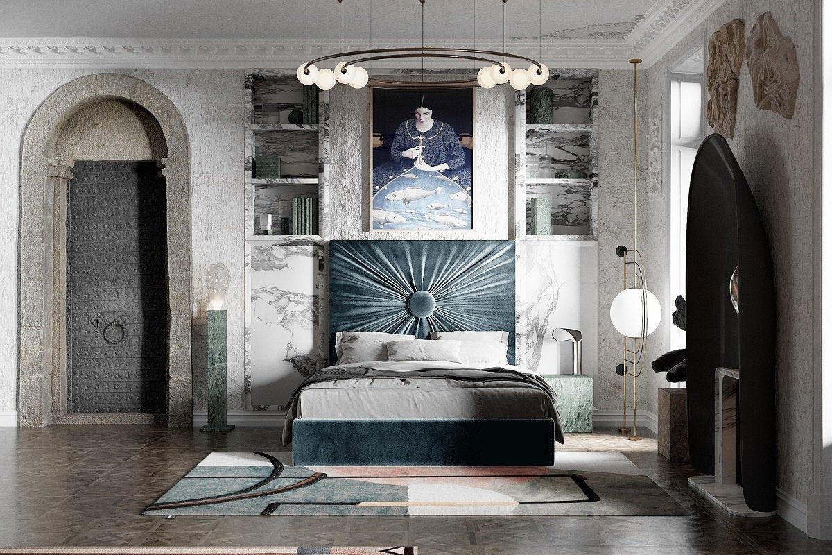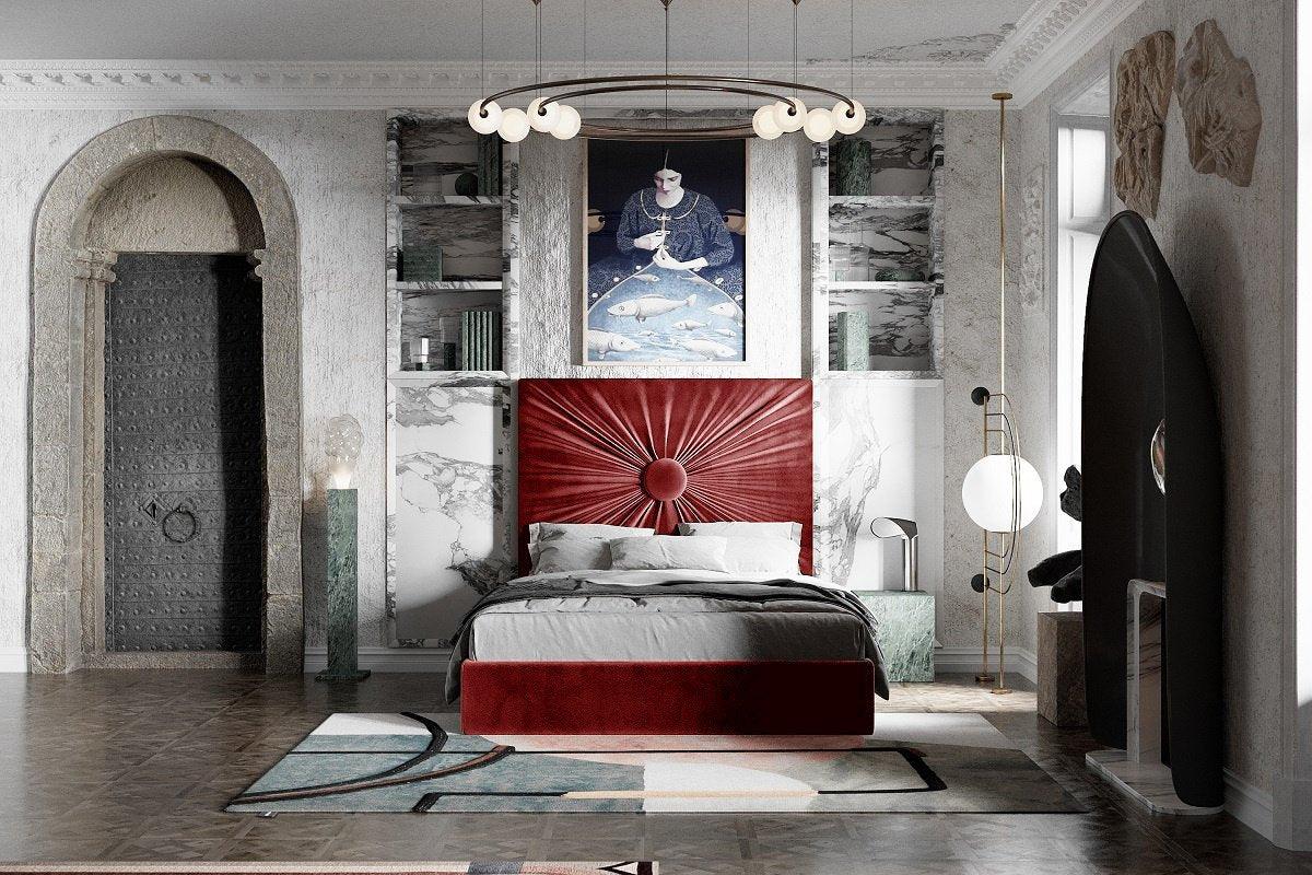 Dieses erstaunliche Design von Katarzyna Jasyk ist die Quintessenz von moderner Eleganz. Das Bett ist aus einem angenehmen und strapazierfähigen samtigen Stoff gefertigt. Die außergewöhnliche Kopfstütze, die dem Schlafzimmer einen originellen Charakter verleiht, erinnert an die Sonne im Zenit. Wenn Sie morgens in so einer besonderen Einrichtung aufwachen, wird der Tag sofort schöner.