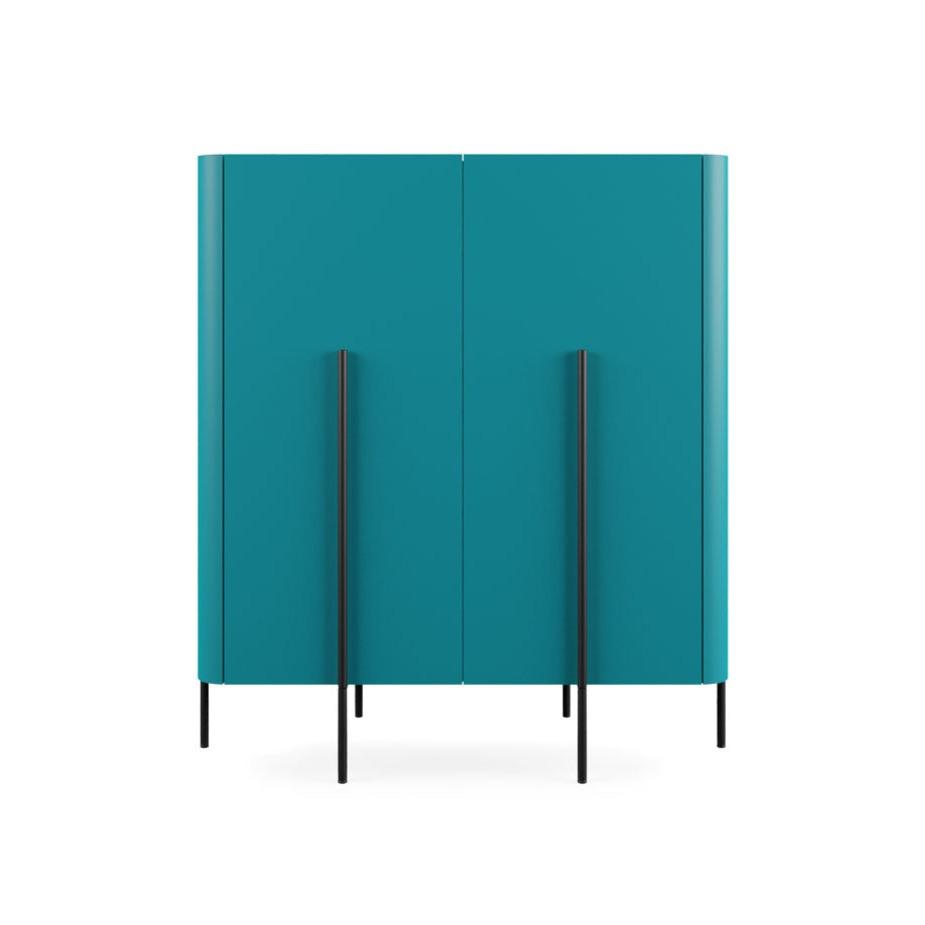 Die Metallrahmen, auf denen die abgerundeten Elemente ruhen, erinnern ein wenig an die Struktur eines Käfigs, erscheinen jedoch so, um die einzelnen Teile zu formen und hervorzuheben. Was diesen türkisfarbenen Schrank wirklich auszeichnet, ist die goldene Kapsel, die am Ende des schwarzen Rohrs platziert ist - ein charakteristisches Detail, das den Stil der Marke Liu Jo prägnant hervorhebt. Dieses kleine, aber markante Merkmal verleiht dem Möbelstück Eleganz und Luxus, zieht die Blicke auf sich und begeistert mit Ihrem subtilen Glanz.