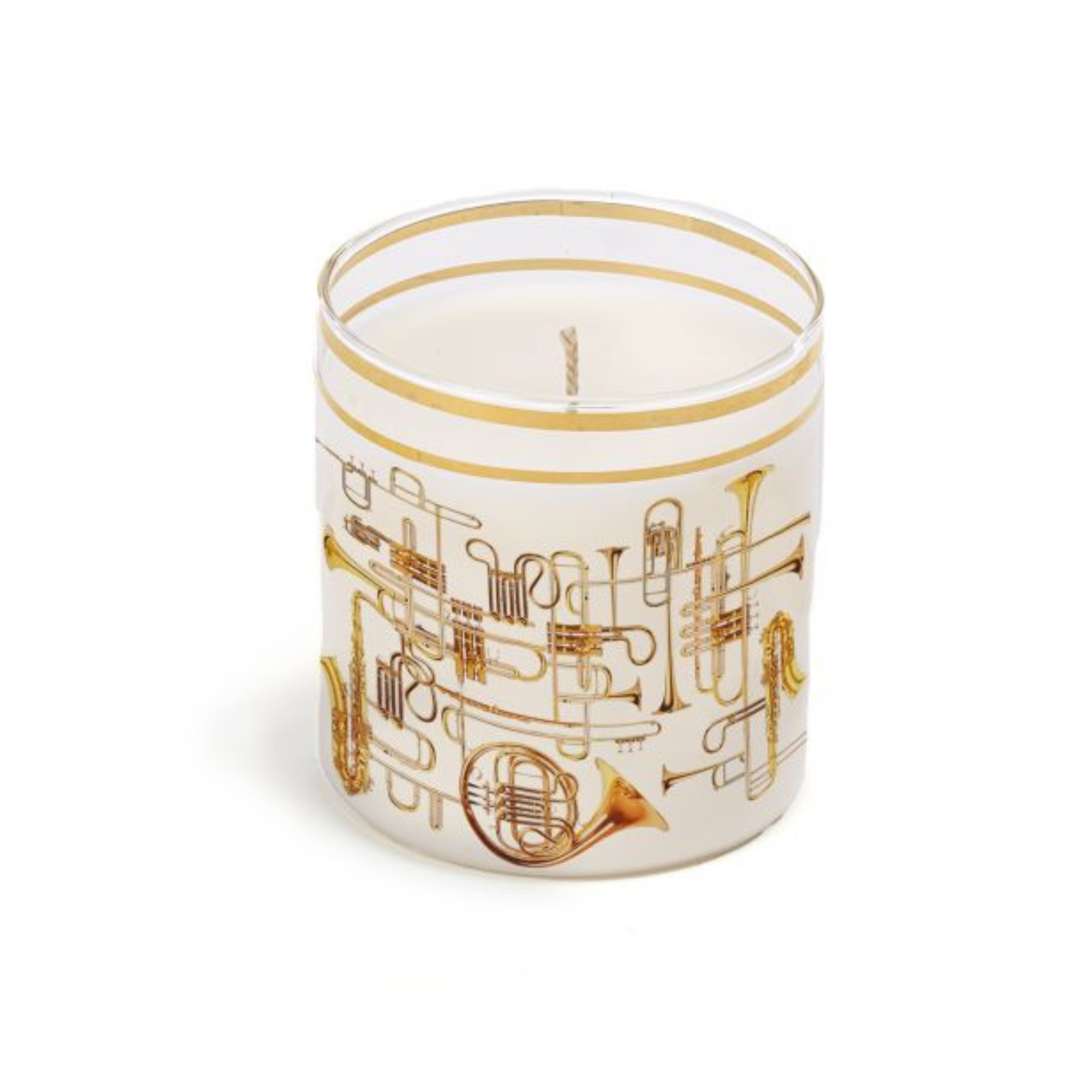 Die Kerze Trumpets ist ein elegantes Accessoire für Musikliebhaber und außergewöhnliches Design. Der Glasbehälter, verziert mit goldenen Grafiken von Trompeten, bringt einen raffinierten, künstlerischen Akzent in jedes Interieur und passt perfekt zu klassischen oder modernen Räumen.