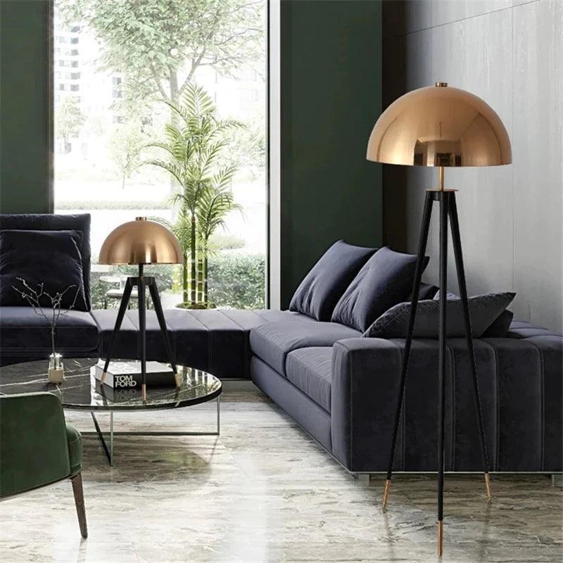 Stehlampe Coyote ist die Quintessenz des modernen Stils der Mid-Centure, die jedem Raum und einem raffinierten Design eine gemütliche Atmosphäre verleiht. Der goldene Finish des Dome -Lampenschirms verleiht der Lampe Eleganz, während schwarze verengte Beine mit Messingabdeckungen einen subtilen Kontrast einführen und ein harmonisches und modernes Ganze erzeugen.