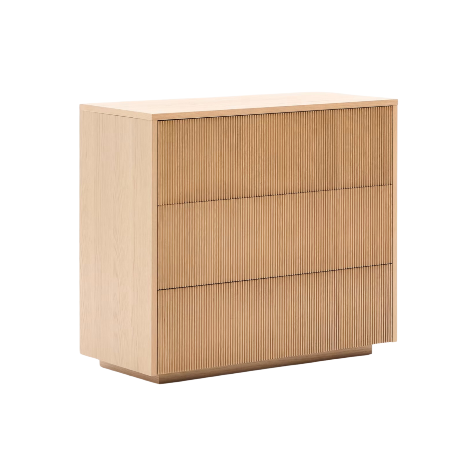 Drei geräumige Schubladen, die auf Berührung geöffnet werden, sind mit versteckten, verstellbaren Führungen ausgestattet und bieten eine bequeme Aufbewahrung. Die Regler an der Unterseite gleichen Unebenheiten des Untergrunds aus und garantieren die Stabilität des Möbelstücks. Die Kommode fügt sich perfekt in die anderen Elemente der Kollektion Helvine ein und schafft einen harmonischen und funktionalen Raum.