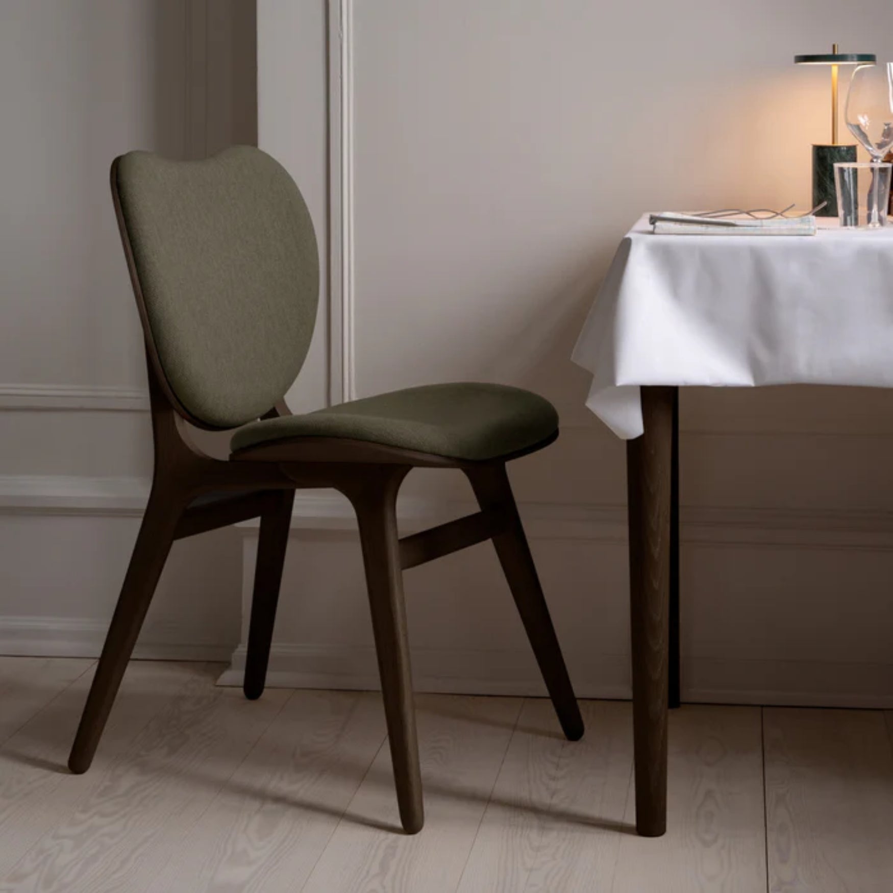 Stuhl CONVERSATION grün mit einem Gestell aus Nussbaumholz