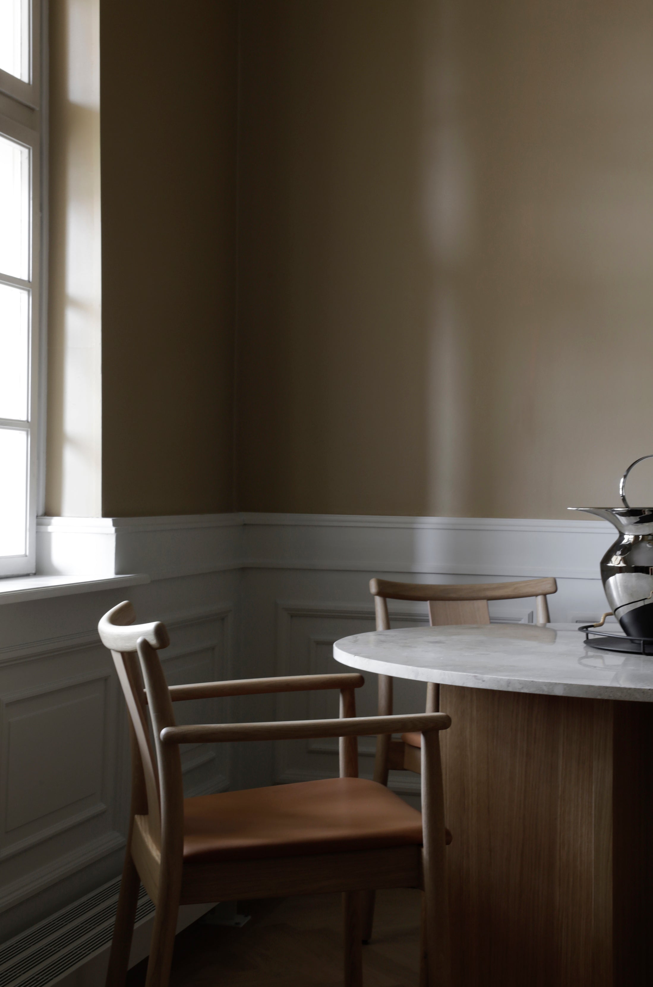 Stuhl Merkur mit Armlehnen ist eine moderne Interpretation des archetypischen Esszimmerstuhls, geschaffen von dem Designerduo Skogstad & Wærnes. Das Design wurde ursprünglich für die monumentale Börse in Oslo entworfen und vereint zeitlose Form mit traditionellen Tischlertechniken. Hergestellt aus massivem Eichenholz und Sperrholz, erhältlich in einer Variante mit teilweiser Polsterung aus Stoff oder Leder, bietet es Eleganz und hohen Nutzungskomfort.
