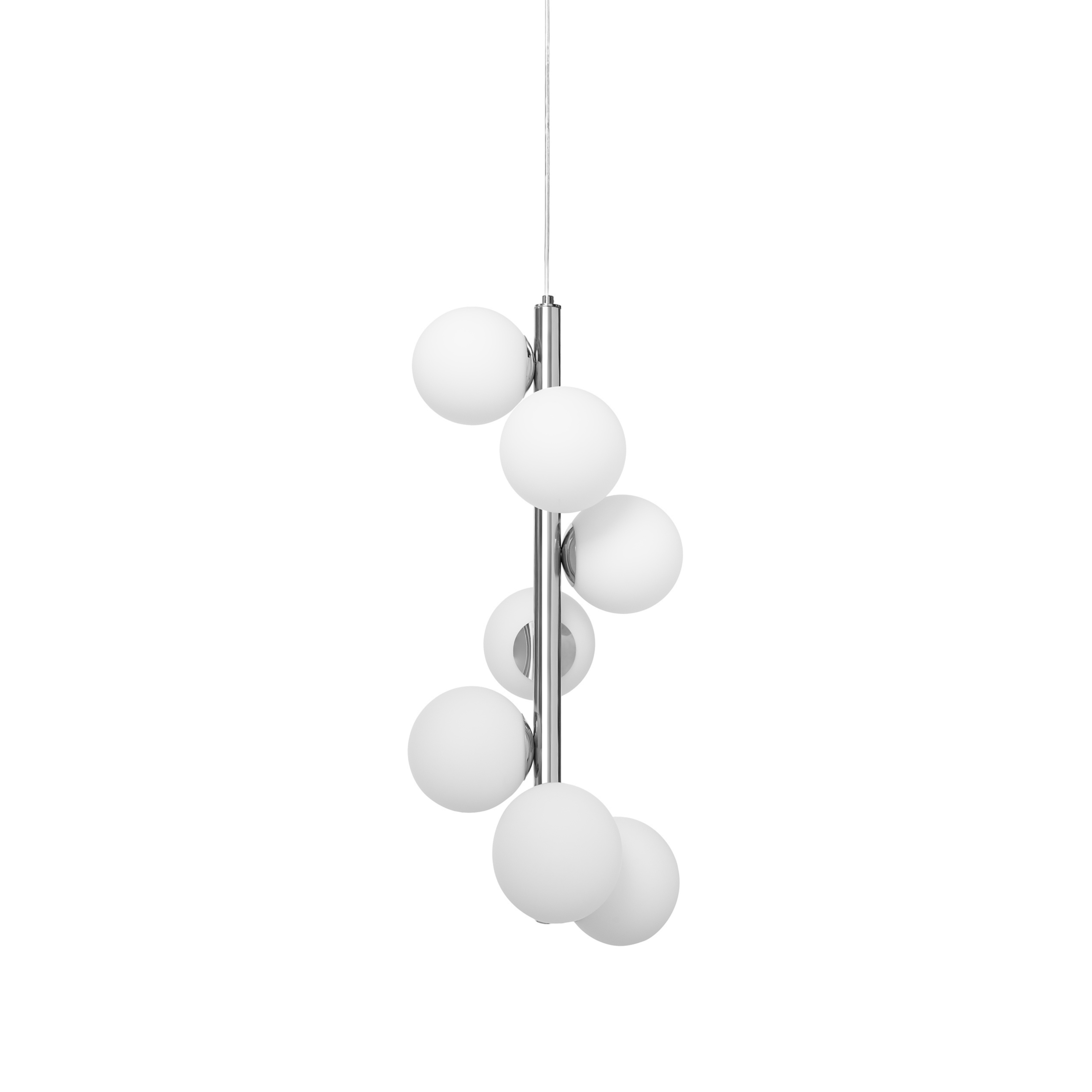 Elegante Pendelleuchte Cumulus Vertical ist ein Design, das mit seiner subtilen Form und modernen Ausführung begeistert. Sieben kugelförmige Schirme aus opalem Glas, die um ein vertikales Gestell angeordnet sind, erzeugen den Effekt eines leuchtenden Traubenclusters, das an in der Luft schwebende Wolken erinnert. Die Ausführung in glänzendem Chrom unterstreicht den modernen, zeitlosen Charakter der Leuchte und verleiht ihr edle Kühle und Eleganz.