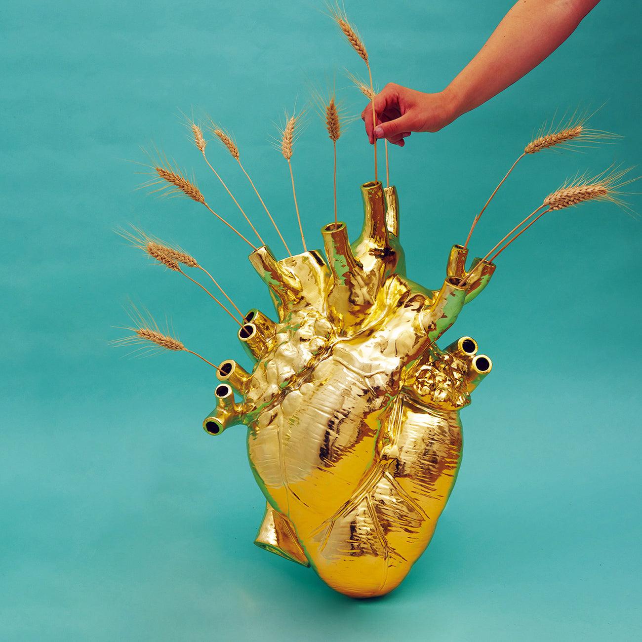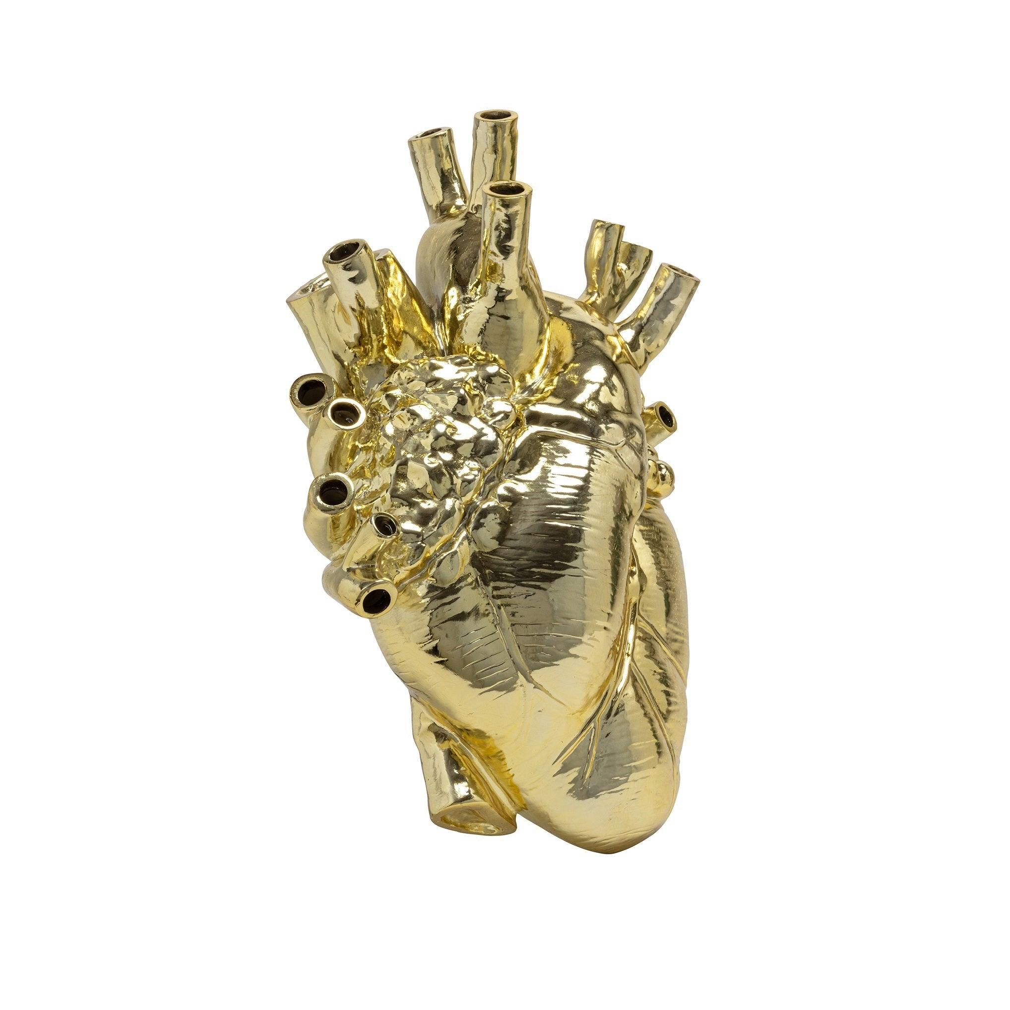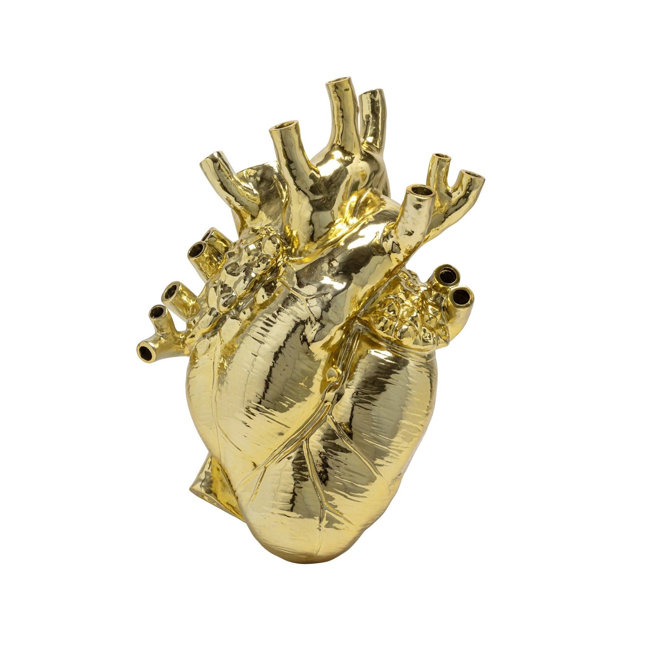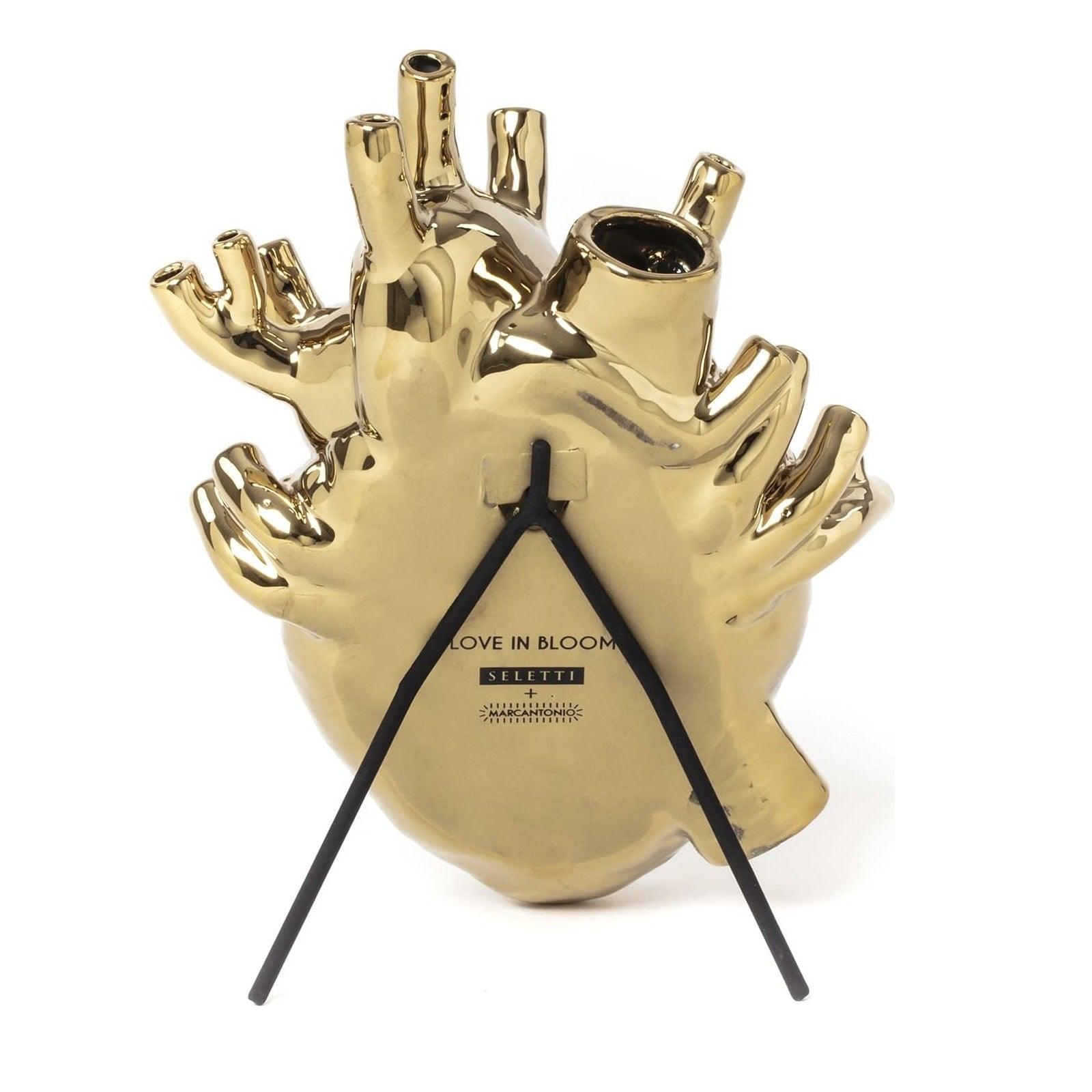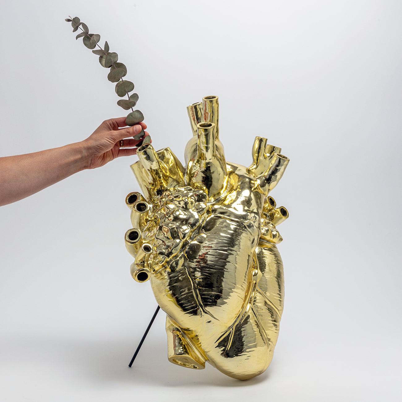 Goldene Vase Liebe in Blüte ist nicht nur wegen ihrer Form, sondern auch für die verwendeten Materialien einzigartig. Das Ganze bestand aus elegantem, weißem Porzellan, das ihm außergewöhnliche Delikatesse und Klasse verleiht. Diese Subtilität steht im Gegensatz zur kühnen Form des Herzens, was diesem Objekt einen einzigartigen Charakter verleiht.