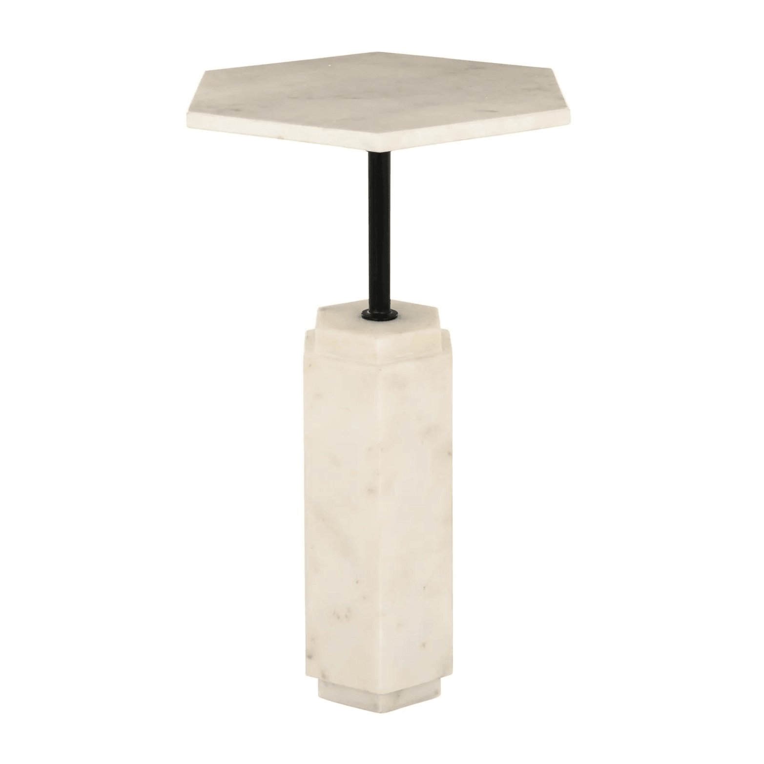Der sechseckige Oberteil und der zarte Rahmen geben der Tabelle moderne Eleganz. Tisch Mit einer Höhe von 53 cm ist es ideal als Beistelltisch neben dem Sofa oder Sessel. Die Marmoroberfläche bietet nicht nur ein attraktives Aussehen, sondern auch eine einfache Oberfläche. Der Lilith -Seitentisch wurde sorgfältig hergestellt und erfüllt die höchsten Standards für Stabilität und Ästhetik.
