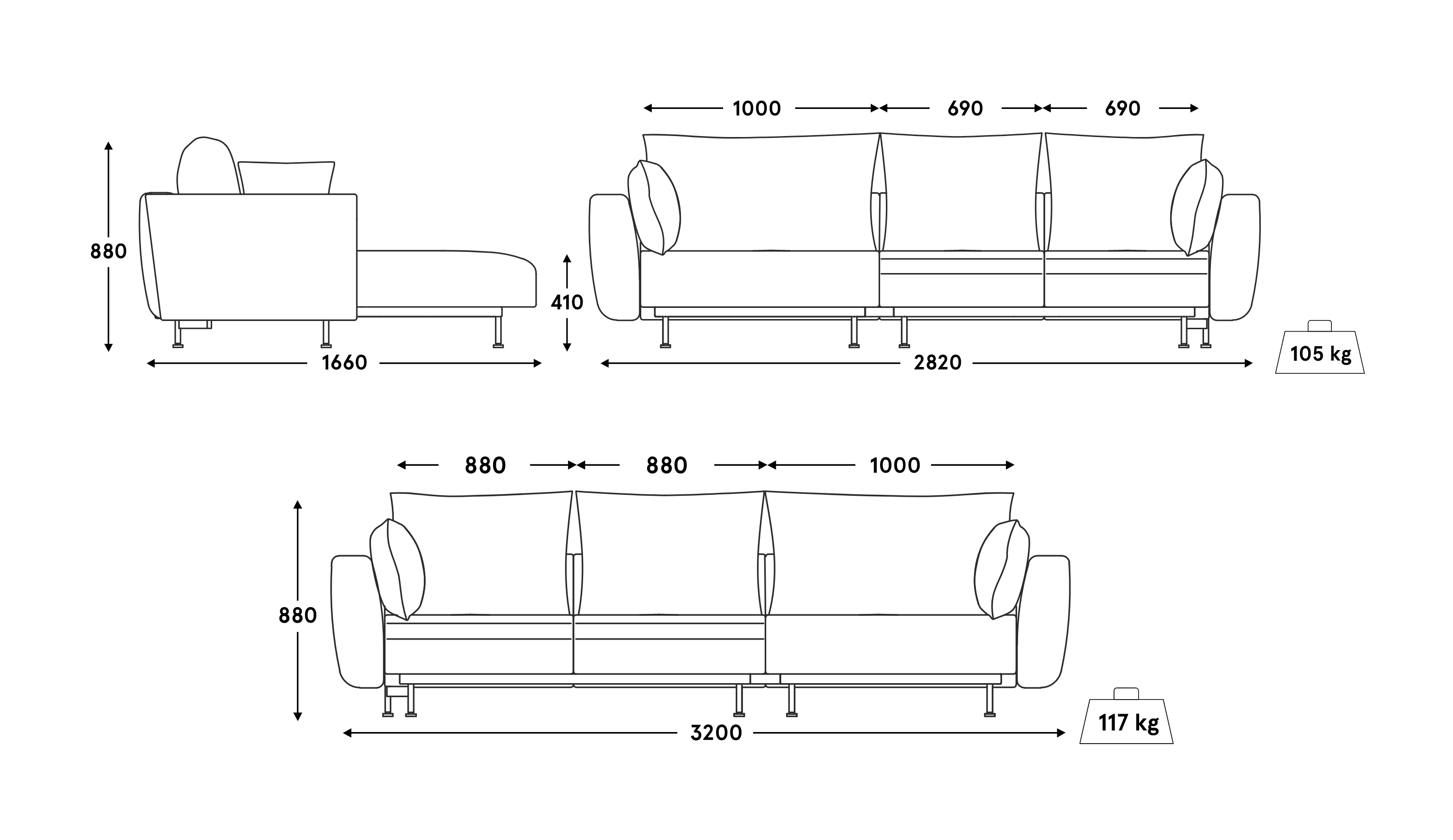Die Kissen bestehen aus einer Mischung aus geschnittenem Silikonschaum und Polyurethan, die sowohl Weichheit als auch Flauschigkeit der Rückenlehne sowie das richtige Volumen und die Elastizität gewährleisten. Die Laminierung des Stoffes verhindert das Falten und Verformen, sodass das Sofa selbst nach langer Nutzung wie neu aussieht. Die Metallfüße mit Filzunterlagen sorgen für Stabilität des Sitzes auf jedem Untergrund und bieten Schutz vor Kratzern auf der Bodenoberfläche.