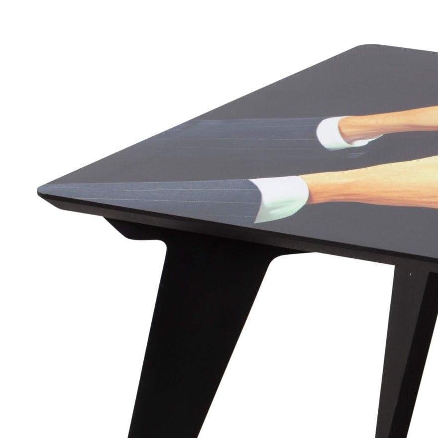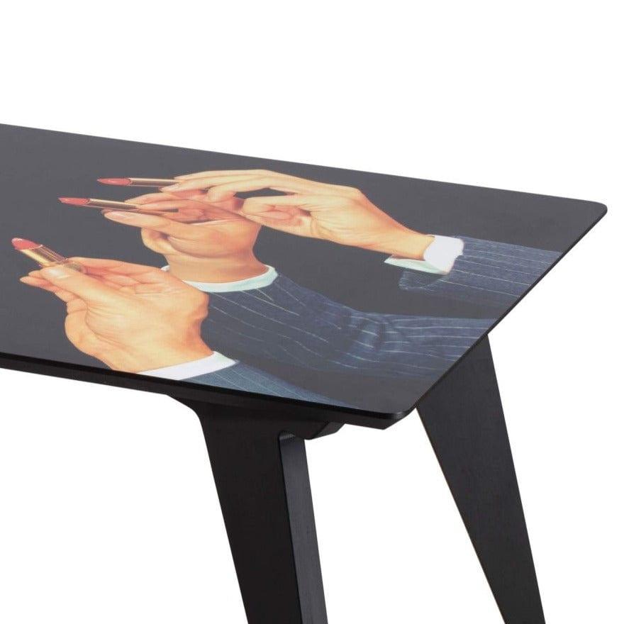 Designertisch im Stil der 70er Jahre, die Wie ein Tor zu einer anderen surrealen Dimension verleiht es dem Innenraum einen einzigartigen Charakter. Distitorische Beine und eine leicht kontroverse Collage auf der Spitze erzeugen ein originelles Kunstwerk. Blieb drinGewissenhaft in Italien, was eine hohe Qualität garantiert.