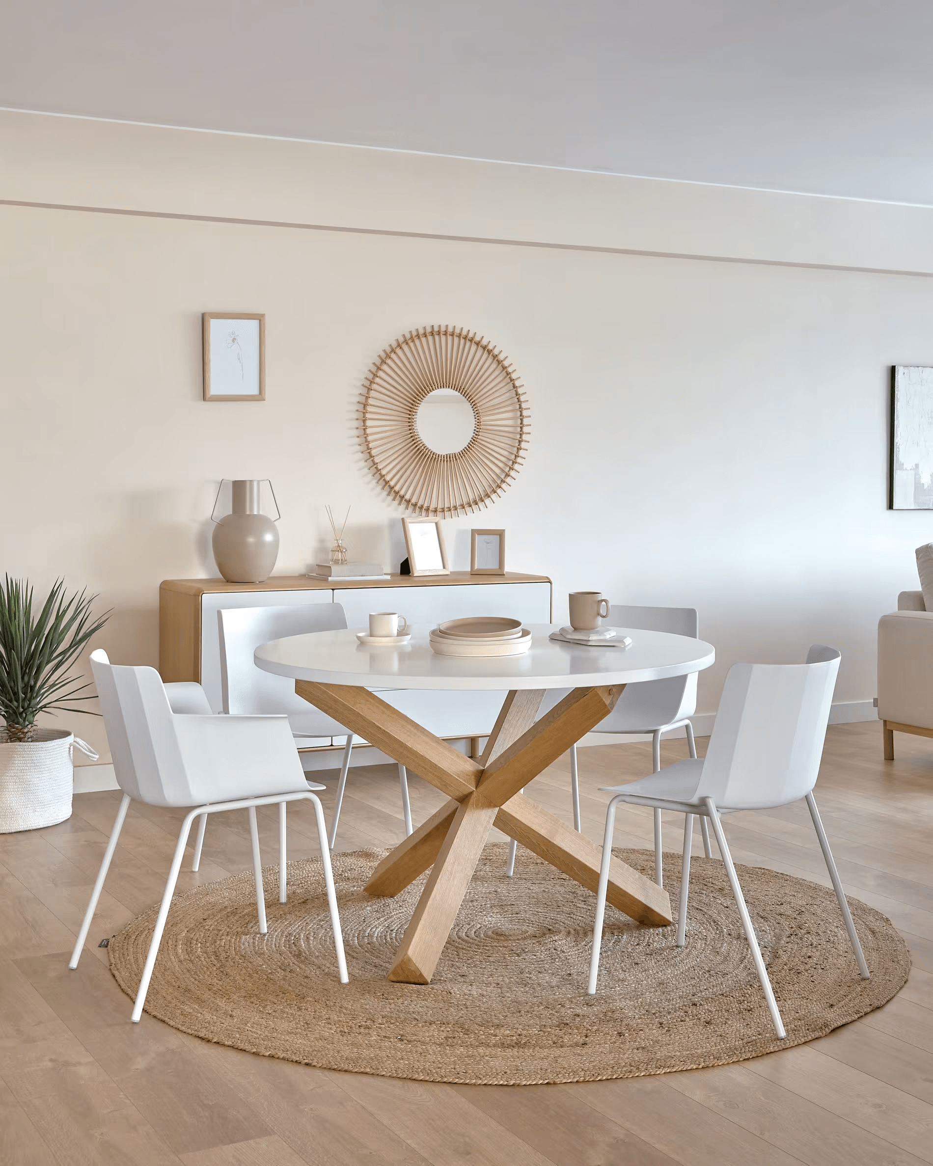 Tisch Lotus in White mit einer Holzbasis ist eine perfekte Lösung für diejenigen, die modernes Design und Funktionalität in ihren Raum einbringen möchten. Die runde Form macht es in kleinen Räumen perfekt, nutzt den verfügbaren Raum.