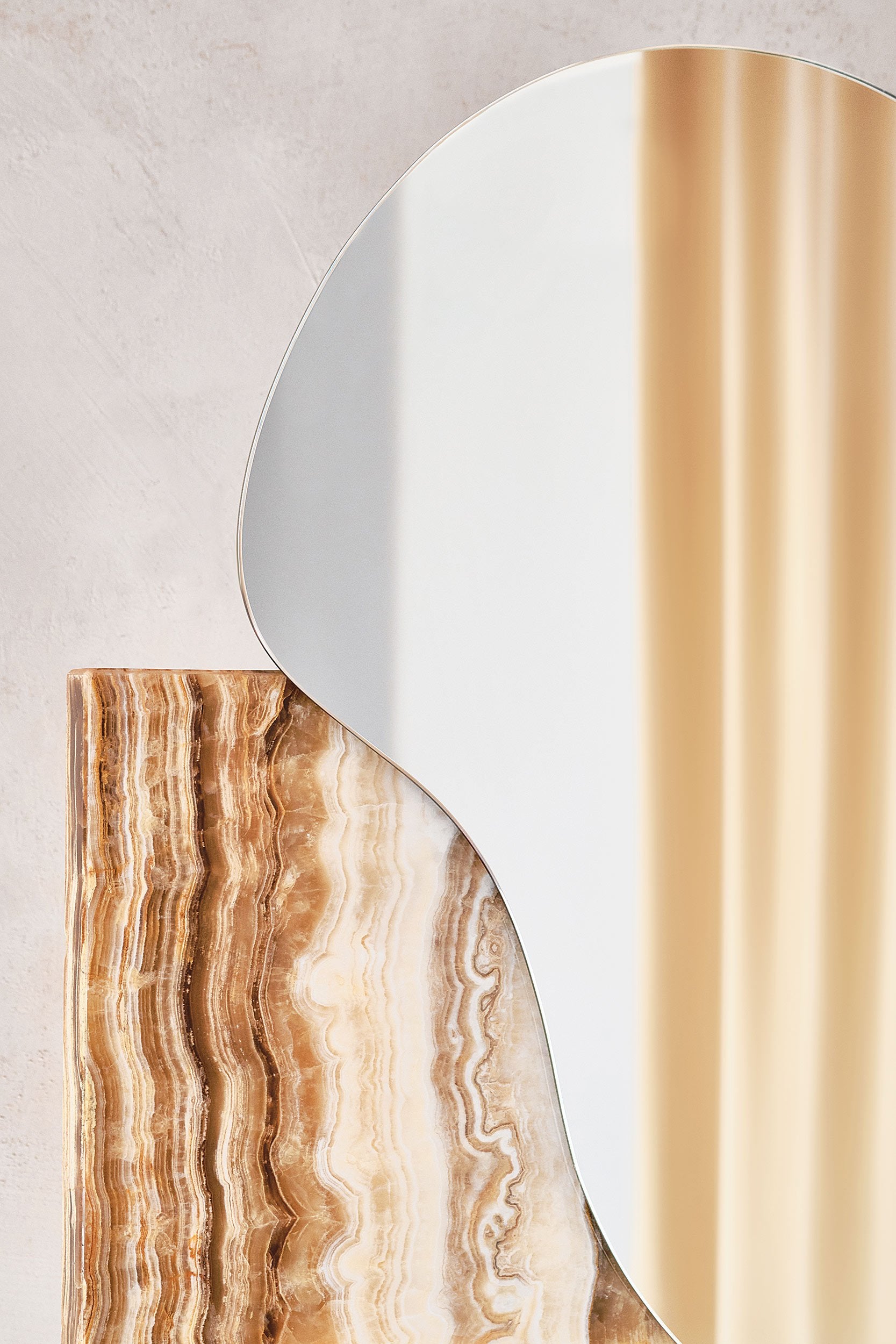Lustro Lake 4 - Limited Edition ist ein einzigartiges Element aus der von der Natur inspirierten Kollektion, entworfen von den französischen Designern Maryna Dague und Nathan Baraness. Die Kollektion Lakes nimmt ihren Namen von den Uferlinien der Seen und ihren geschwungenen Formen, die im Design der Spiegel festgehalten wurden. Die Designer betonen den Kontrast zwischen den fließenden Glasformen und den klaren Linien der Stützen, die aus Materialien wie oxidiertem Kupfer, Onyx und gebranntem Stahl gefertigt sind.