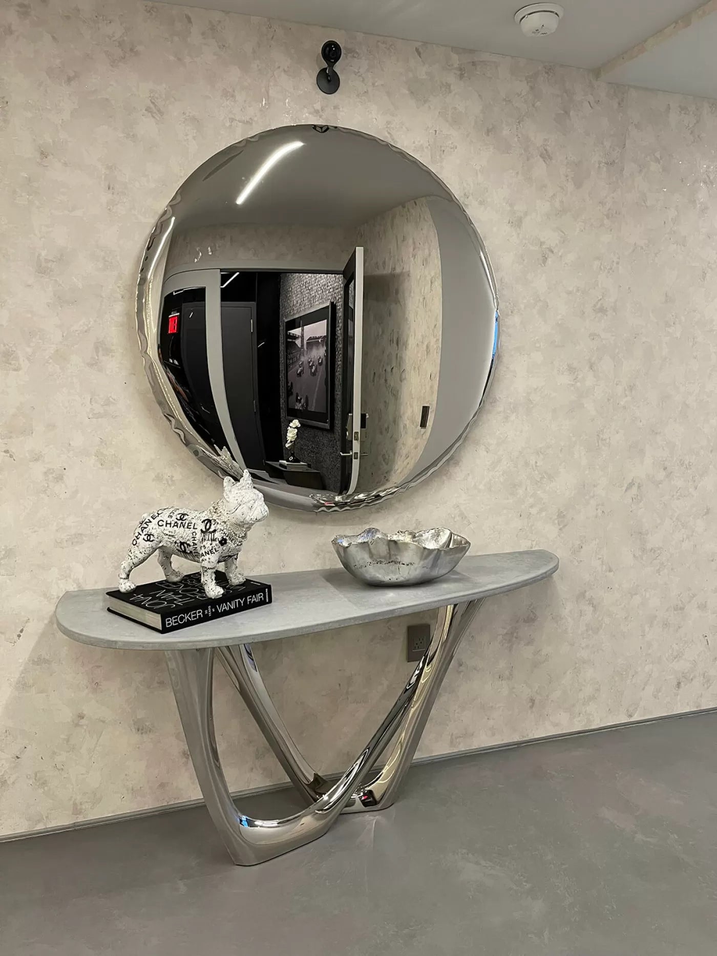 Das an der Wand hängende moderne Spiegel wirkt wie eine Skulptur – es reagiert auf Licht und Bewegung und schafft wechselnde Reflexionen und Tiefe. Die Verzerrungen an den Kanten betonen die Organik der Form, während die glatte Oberfläche zu einer Leinwand wird, die die Realität auf unkonventionelle Weise widerspiegelt. Das Auge drängt sich nicht auf – es verleiht dem Raum Charakter, egal ob es sich in einem klassischen Wohnzimmer, einer modernen Galerie oder einem minimalistischen Flur befindet.
