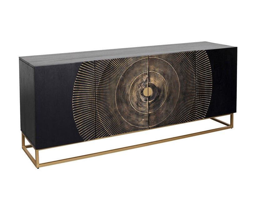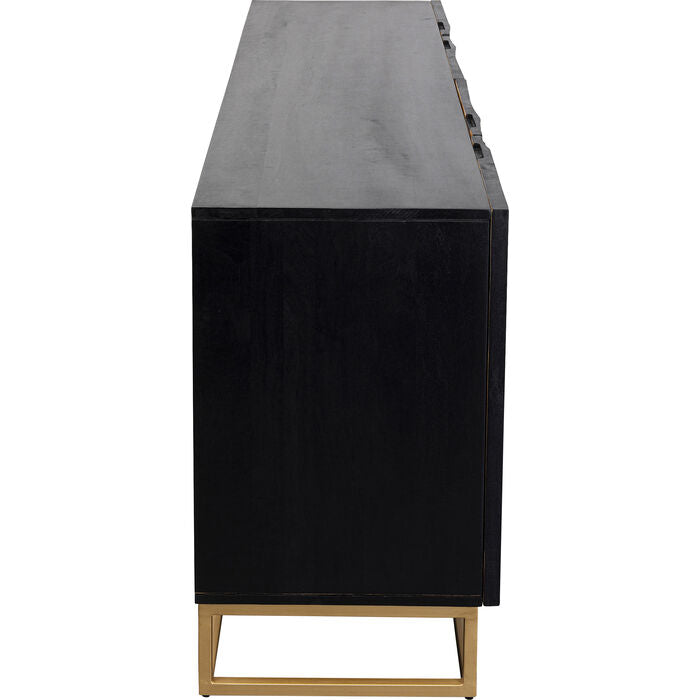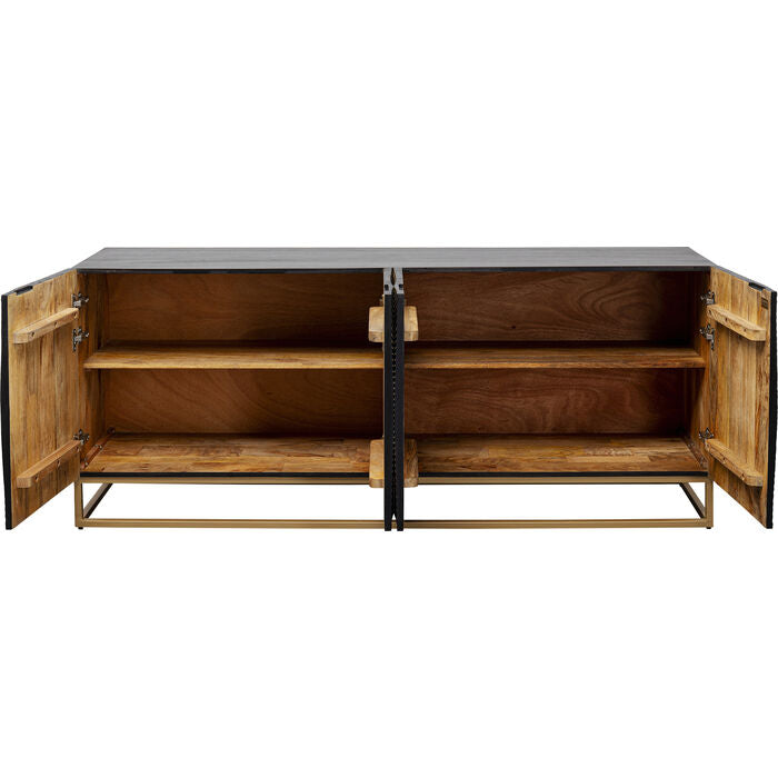 Gefertigt aus massivem Holz und pulverbeschichtetem Stahl, zeichnet sich die Kommode auch durch die verwendeten Materialien aus. Sie kann auch als TV-Schrank dienen und bietet dank einer fest montierten Regalplatte auf jeder Seite ausreichend Platz im Inneren. Ein langlebiges Möbelstück, das mit Sicherheit seinen Wert behält.