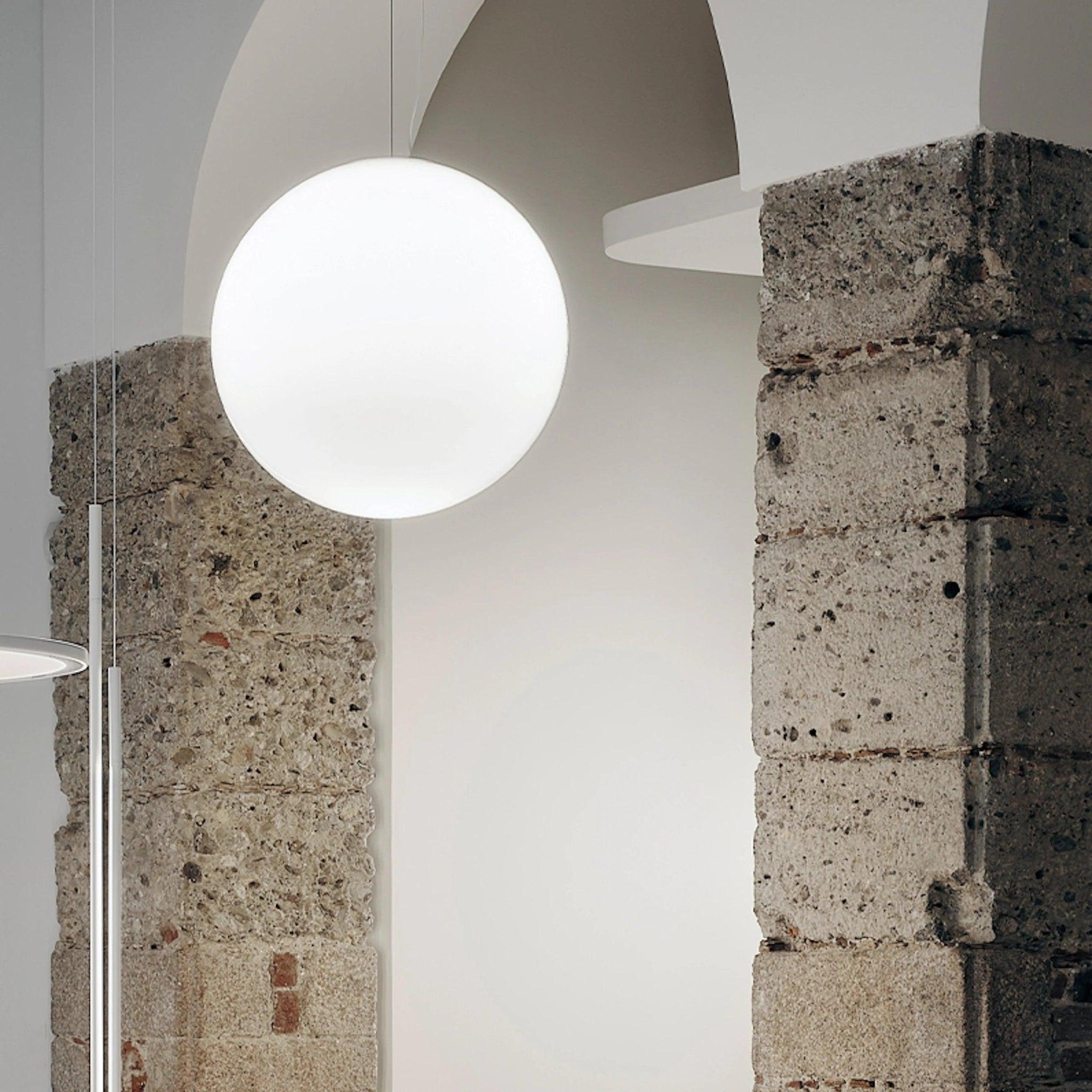 Lampe hängen Komplex eines eleganten halbtransparenten Glasballs, der ein glückseliges Gefühl des Friedens verleiht. Die weiße Farbe ergänzt eine einfache Geometrie, die sich an jeden Stil anpasst. Diese minimalistische Farbe bietet einen zeitlosen Look und ermöglicht die Lampe in verschiedene Stile und Arrangements.