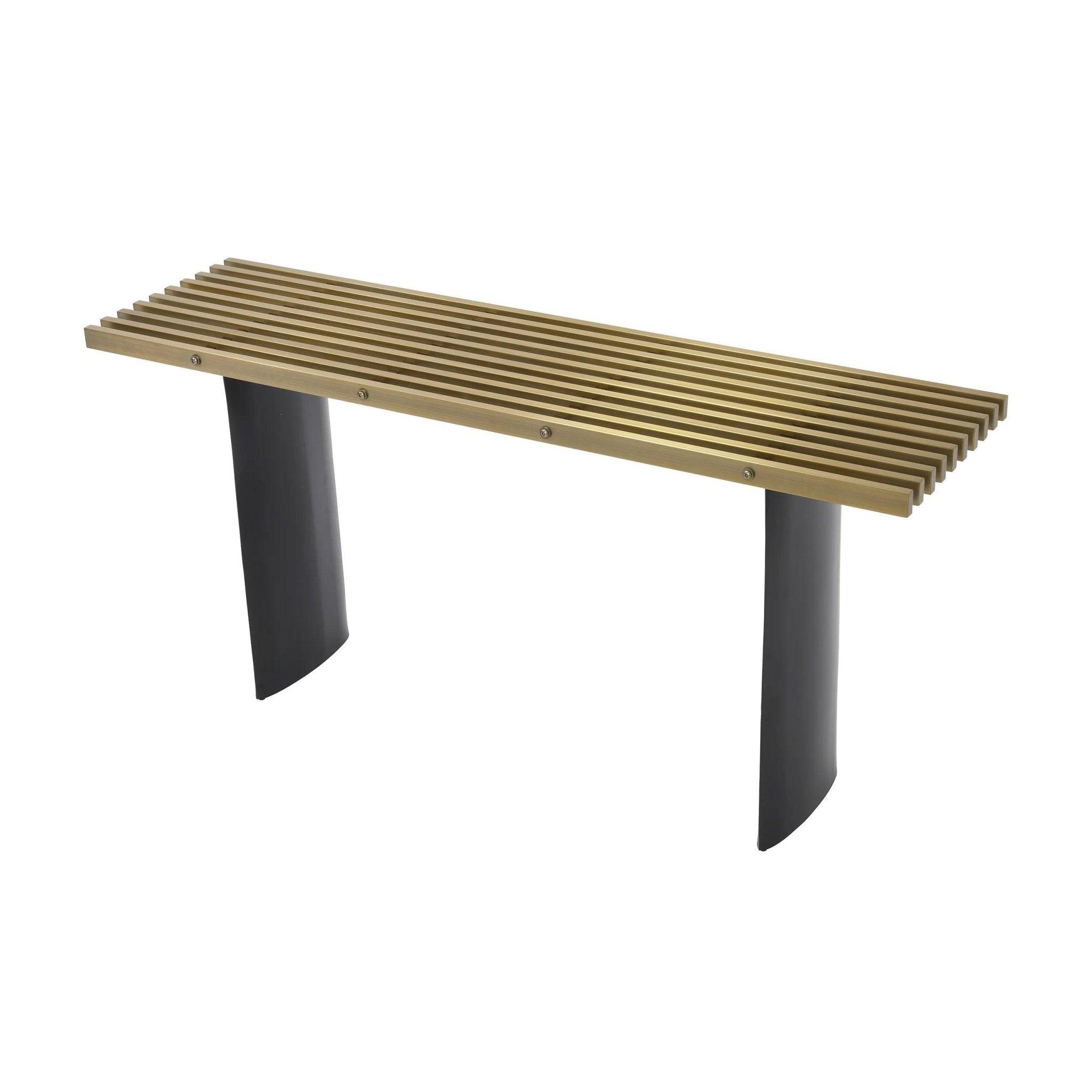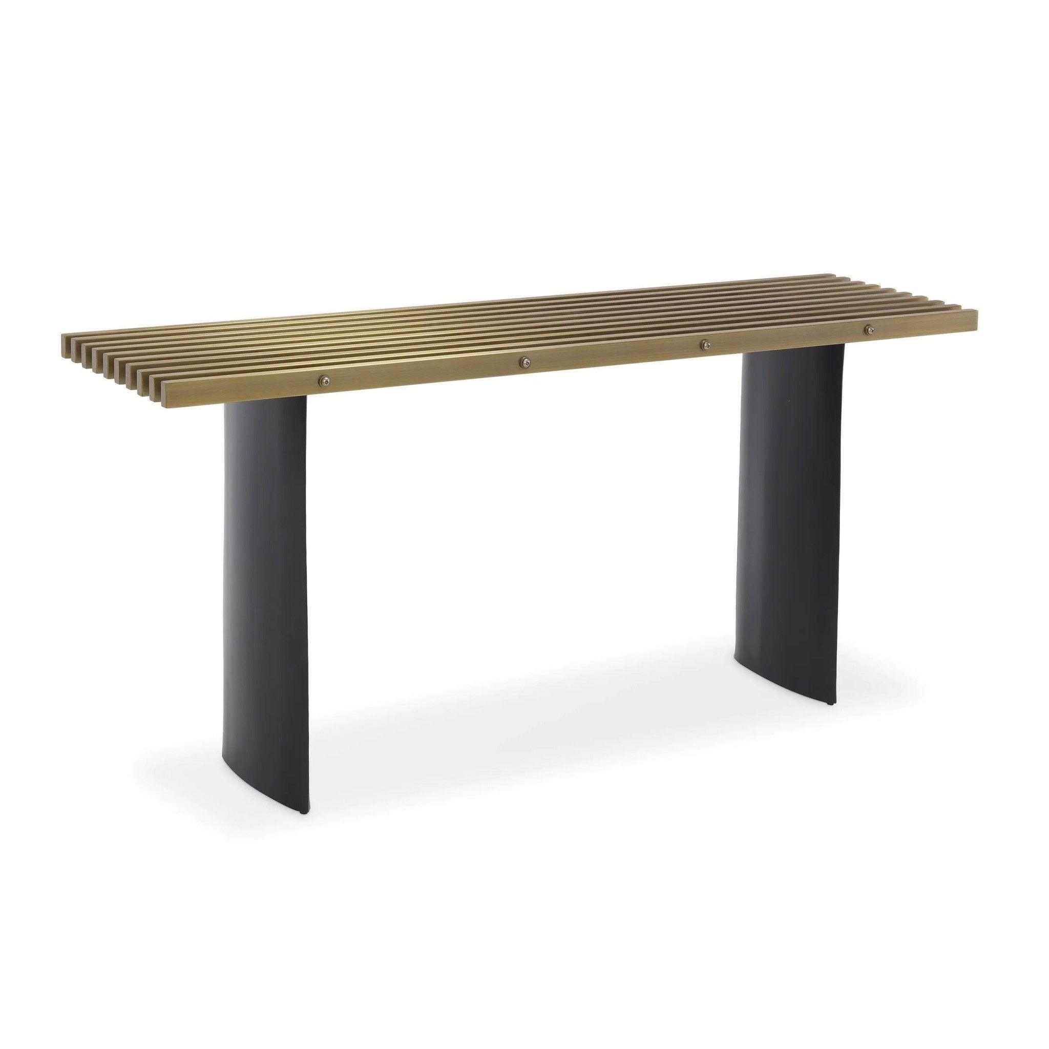 Das Konsolenoberteil aus Metallgitter mit gebürstetem Messing ist nicht nur langlebig, sondern auch extrem stilvoll. Seine geometrische Struktur verleiht den Möbeln Charakter und betont seinen modernen Charakter. In Kombination mit zwei schwarzen elliptischen Beinen wird die Vauclair -Konsole in der Welt der Möbel zu einem echten Kunstwerk.