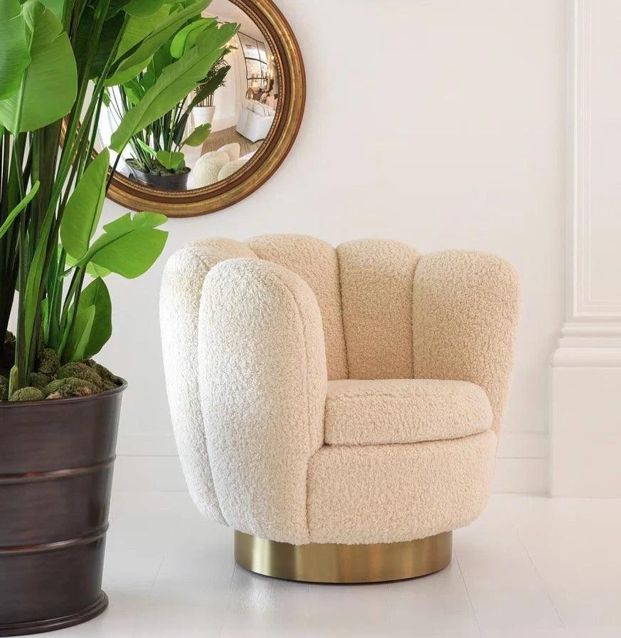 Seine Silhouette, die Sie in einer Muschelform umhüllt, ist wie eine Einladung zur Entspannung und Ruhe, gleichzeitig aber auch ein Ausdruck außergewöhnlicher Ästhetik. Der Bezug aus Kunstschafwolle ist nicht nur angenehm im Griff, sondern auch äußerst elegant und verleiht dem Sessel Mirage einen besonderen Charme. Dieser außergewöhnliche Drehstuhl ist nicht nur ein dekoratives Element. Es ist ein wahres Juwel, das die Einrichtung Ihres Raumes vervollständigt und ihm einen einzigartigen Charakter verleiht. Stellen Sie sich vor, wie Sie nach einem langen Tag in diesem komfortablen Sessel sitzen, umgeben von diesem Luxus.