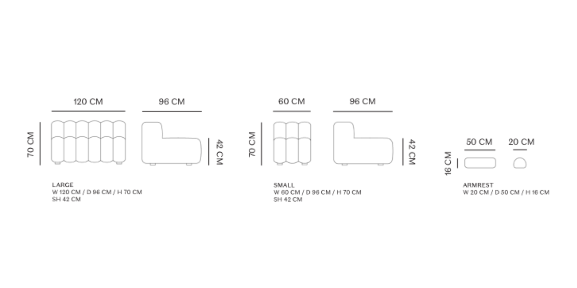 Das Sofa besteht aus zwei großen Modulen, einem kleinen Modul und zwei Armlehnen.