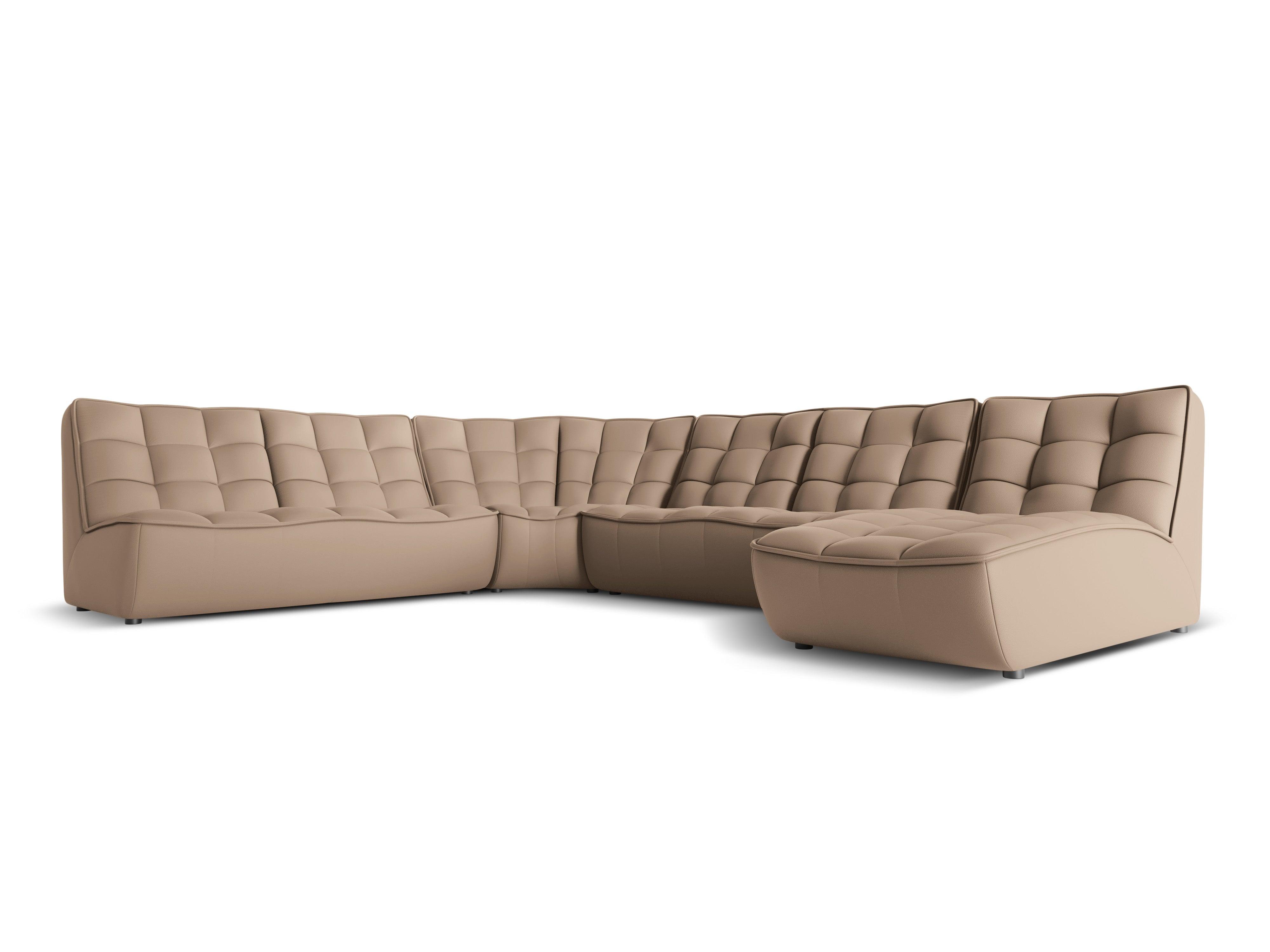 Leder-Ecksofa für acht Personen Moni definiert Funktionalität und Komfort in Kombination mit modernem Design. Stilvolles Steppdesign und die originelle Form eignen sich sowohl für ein elegantes Wohnzimmer als auch für ein modernes Büro. Die Linie der Sitzfläche und der Rückenlehne ist bogenförmig und verfügt über eine sanft geformte Vertiefung, die außergewöhnlichen Nutzungskomfort bietet.
