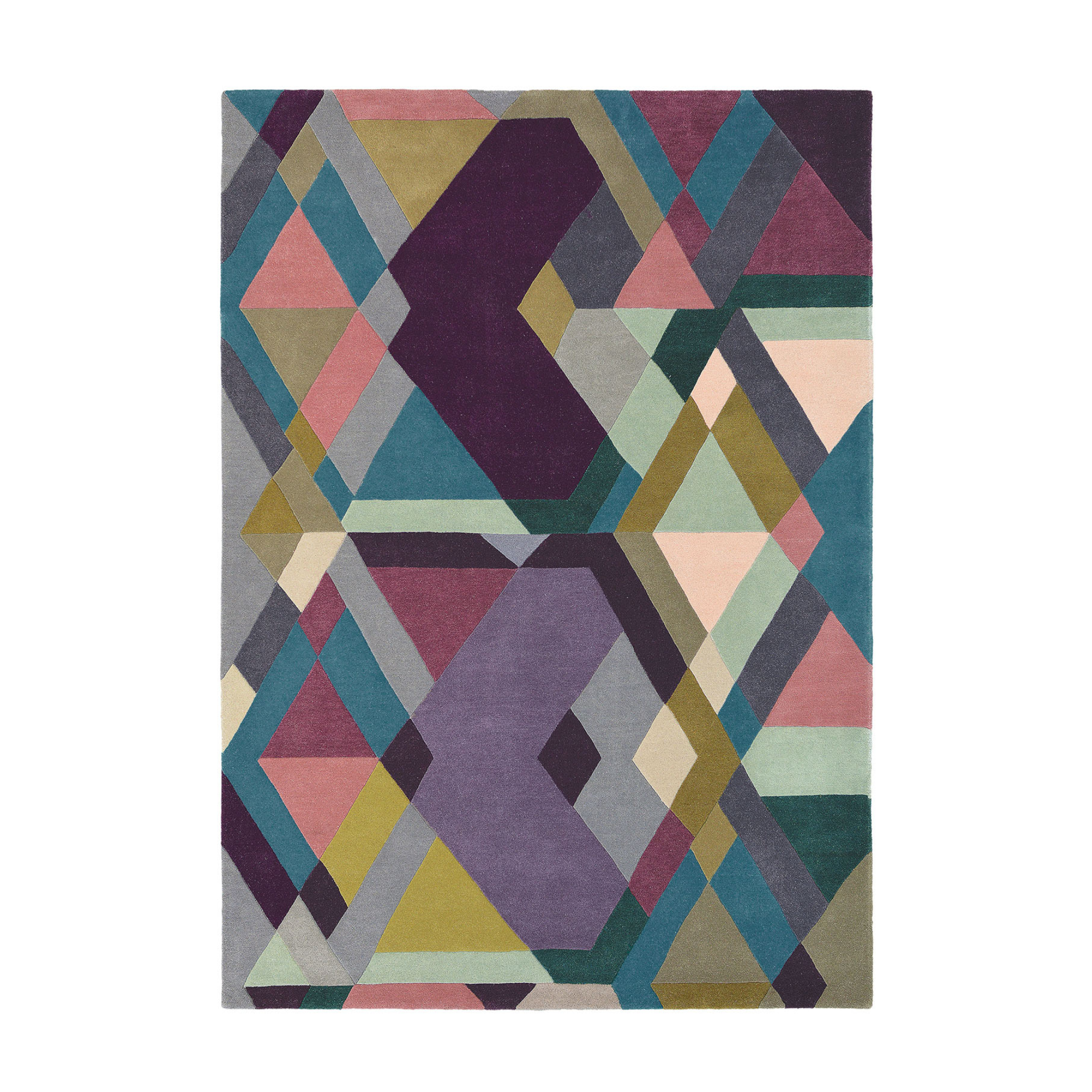 Der farbenfrohe geometrische Teppich ist eine Kombination aus einem modernen Muster und einer wirkungsvollen Farbpalette, die die Einrichtung Ihres Wohnzimmers perfekt ergänzt. Es wurde sorgfältig aus hochwertiger Schurwolle gefertigt und kombiniert Schnittflor mit Schlingengewebe, wodurch es Weichheit und Eleganz bietet.