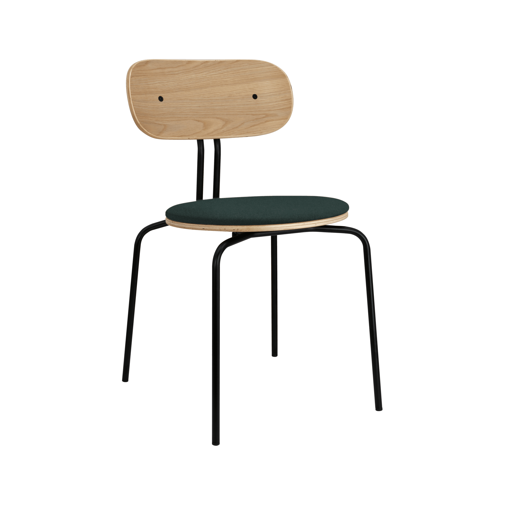 Stuhl Neugierig ist elegant, leichte und minimalistische Möbel aus Eichenfurnier. Es ist mit Messing- oder schwarzen Beinen erhältlich, und das optionale Sitzkissen bietet zusätzlichen Komfort. Sie können ein Kissen aus 17 Farben des Horizons -Stoffes auswählen, die 100% recycelt sind, sowie in einem braunen oder weißen Schatten mit Teddybärenstoff.
