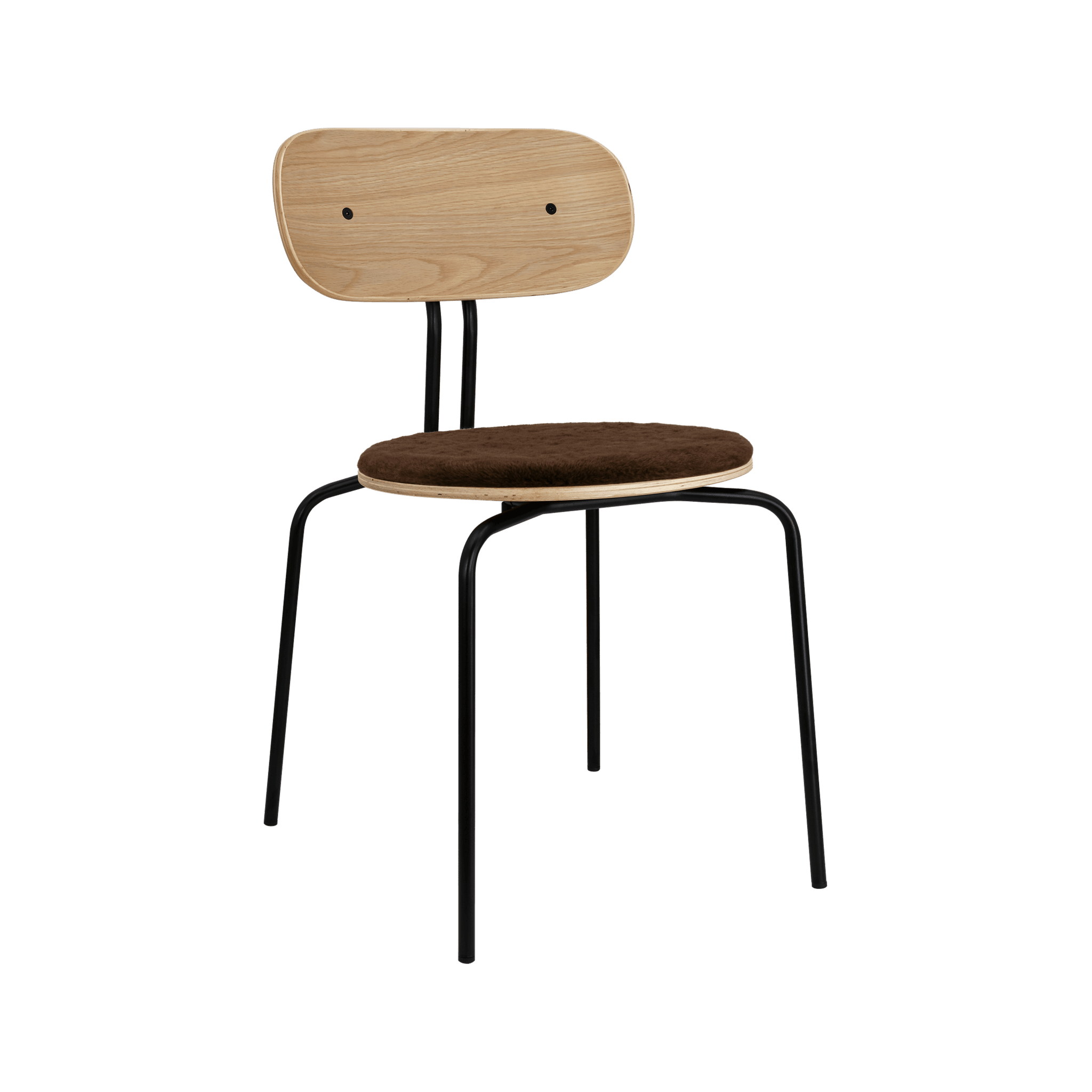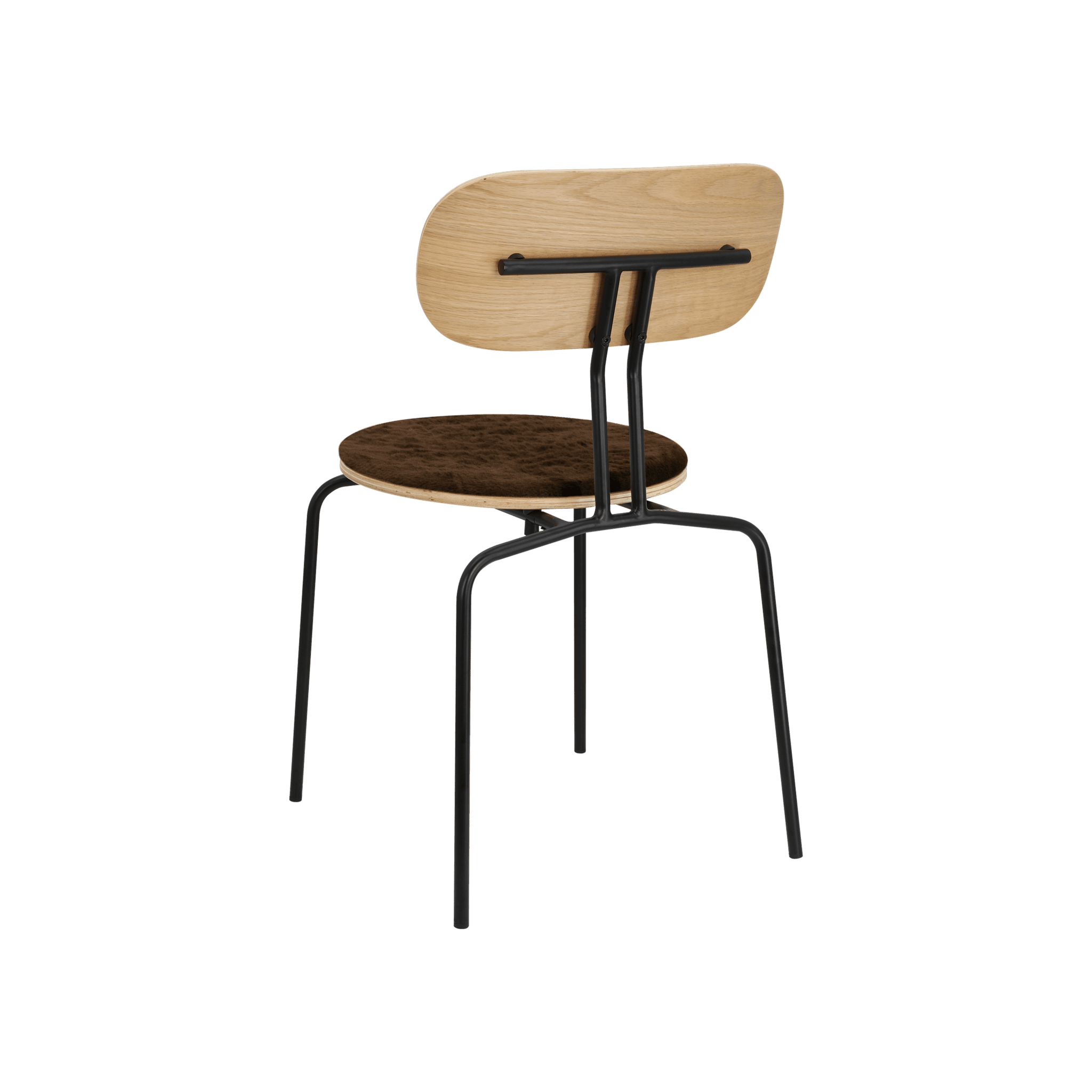 Stuhl Neugierig ist elegant, leichte und minimalistische Möbel aus Eichenfurnier. Es ist mit Messing- oder schwarzen Beinen erhältlich, und das optionale Sitzkissen bietet zusätzlichen Komfort. Sie können ein Kissen aus 17 Farben des Horizons -Stoffes auswählen, die 100% recycelt sind, sowie in einem braunen oder weißen Schatten mit Teddybärenstoff.