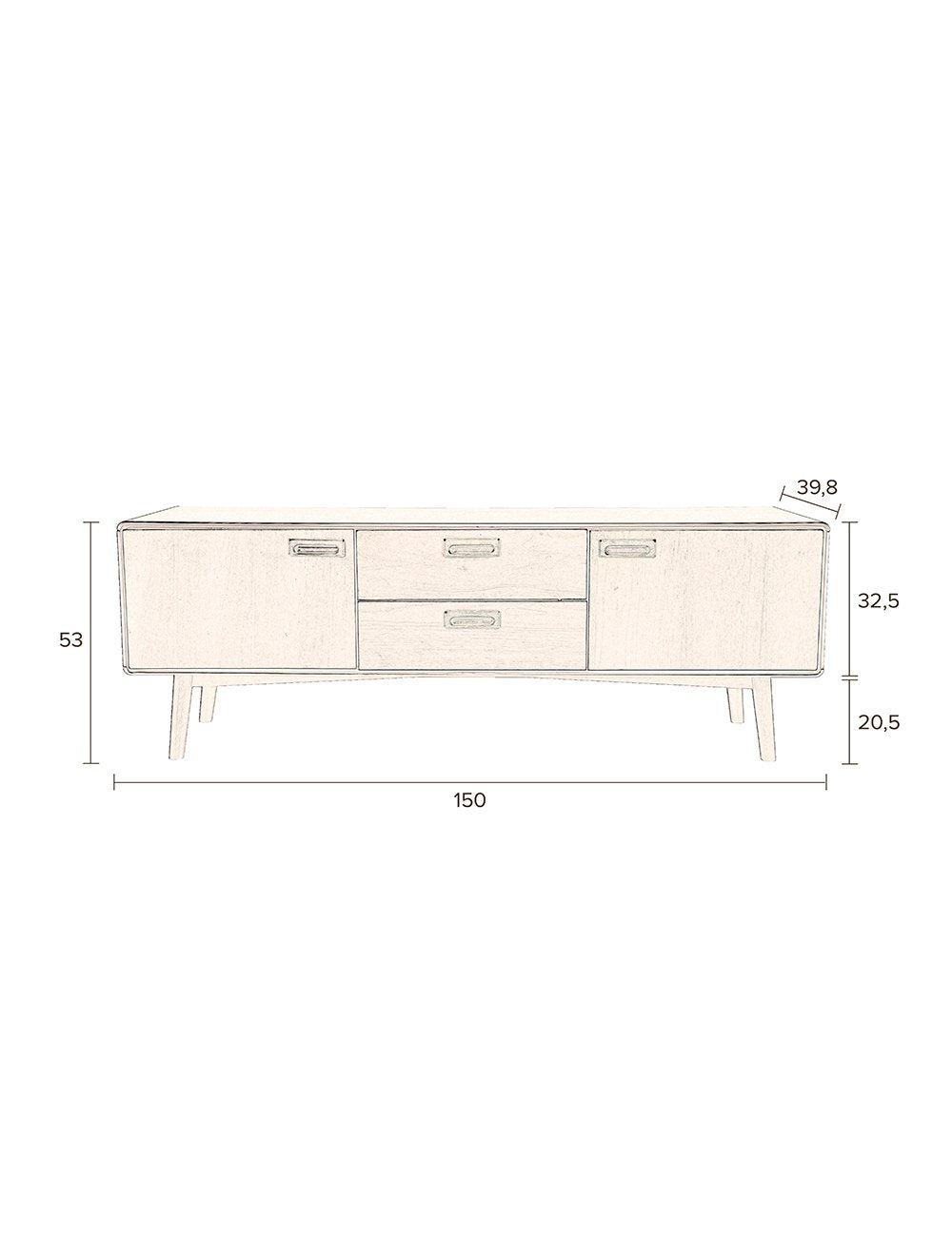 Die gesamte Konstruktion wird durch breite Griffe ergänzt, die das außergewöhnliche Design unterstreichen. Die Kommode verfügt über drei Module mit Regalen sowie eine herausziehbare Schublade, in der all die kleinen Dinge aus dem Wohnzimmer oder Schlafzimmer ihren Platz finden.