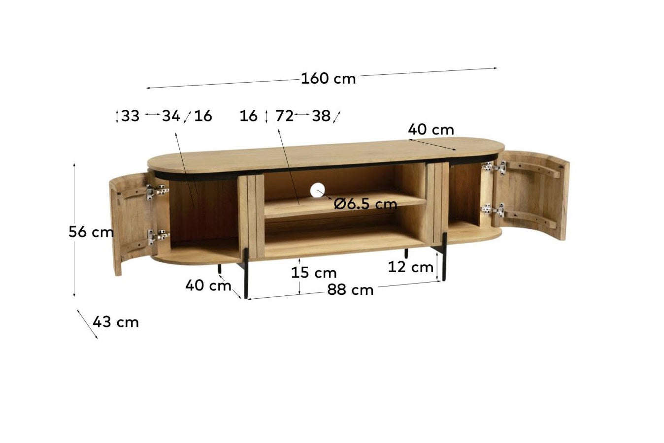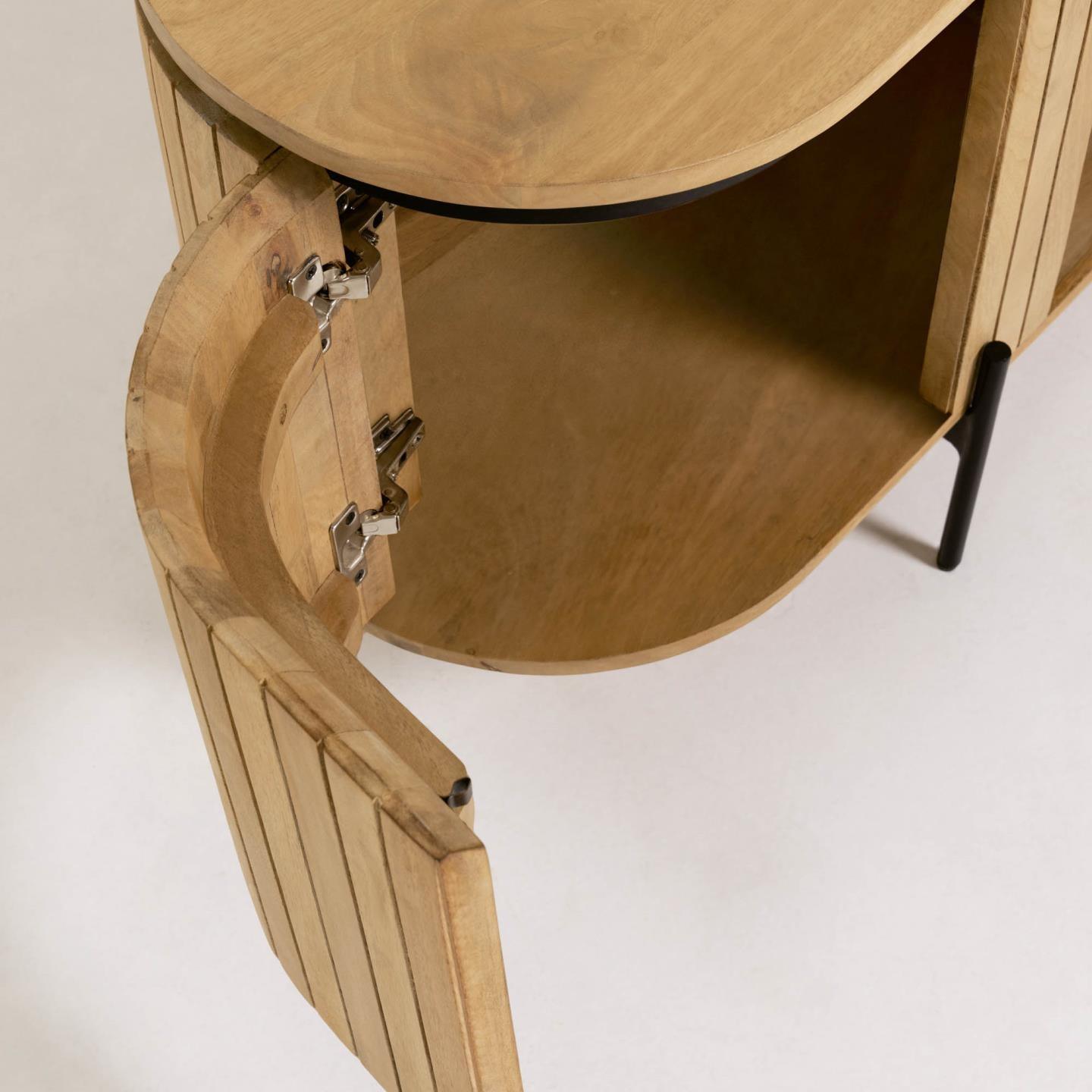Ein besonderes Merkmal des RTV Licia Schranks ist die präzise Befestigung der einzelnen Elemente aus massivem Mangoholz, die ihm seine abgerundete Form verleiht. Dies ist nicht nur ein ästhetischer Aspekt, sondern auch ein Zeugnis für handwerkliche Sorgfalt und Liebe zum Detail. Der exklusive Charakter dieses Produkts wird durch die Tatsache unterstrichen, dass es von dem Team von Kave Home geschaffen wurde, das für seine Innovationskraft und Leidenschaft für die Schaffung außergewöhnlicher Designs bekannt ist.