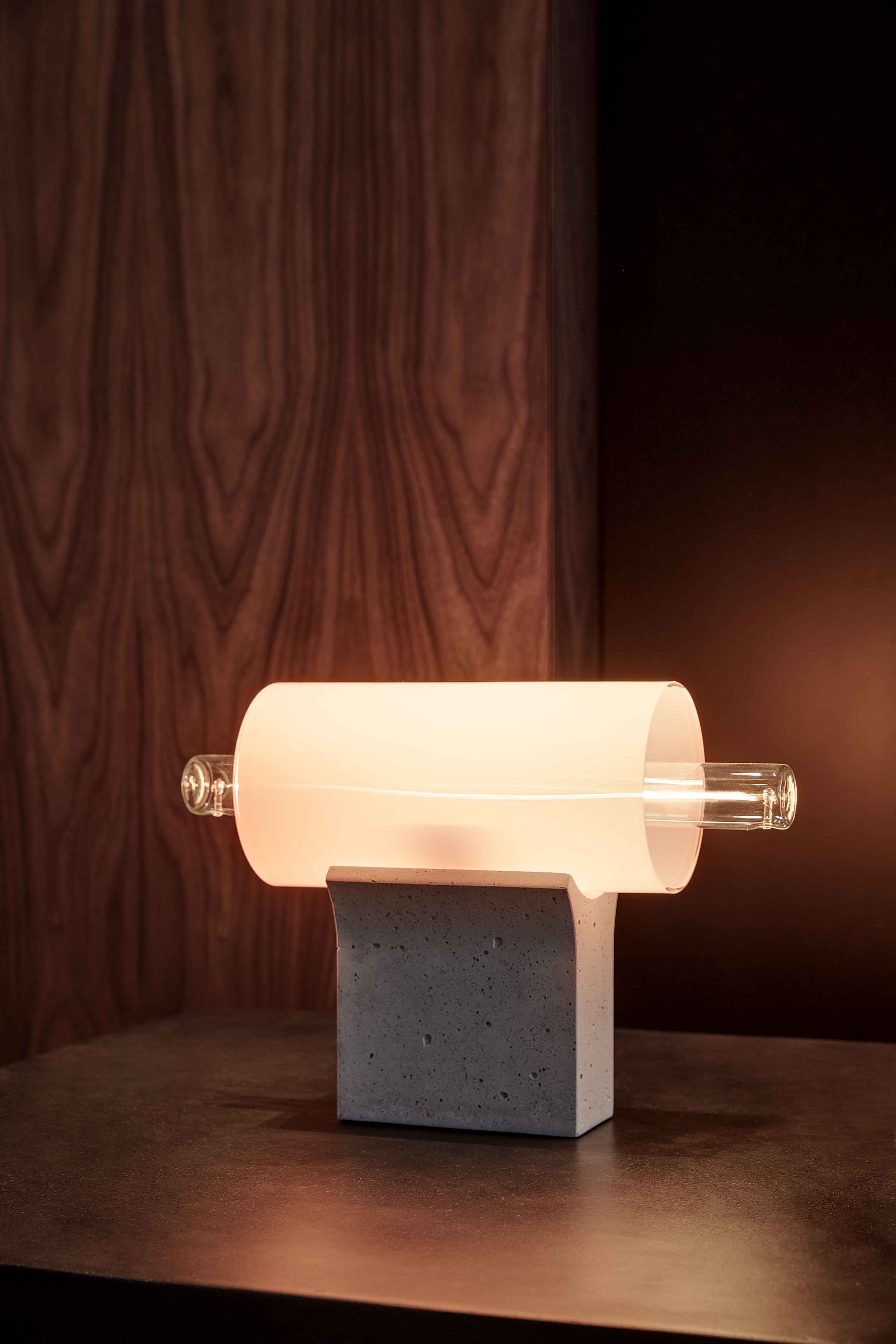Charakteristische Elemente sind aufblasbare, transparente Glasrohre, die sich mit einem Betonrahmen mit Recyclingglas verbinden. Die Betonbasis wird in verschiedenen Formen gebildet, die an alle Arten von Licht angepasst sind, sodass Sie sowohl einfache als auch komplexe Lichtzusammensetzungen erstellen können. Der Mittel des Betonleugels ist mit einer zarten Hülse Matt oder transparentes Glas dekoriert, durch das es das Licht durchbohrt, was den Effekt erzeugt, als würde die fluoreszierende Lampe im Inneren schweben. Die Overlay -Tischlampe verleiht dem Innenraum Eleganz und künstlerischen Ausdruck und verbindet sich sowohl im Heim als auch im Handelsbereich gut.